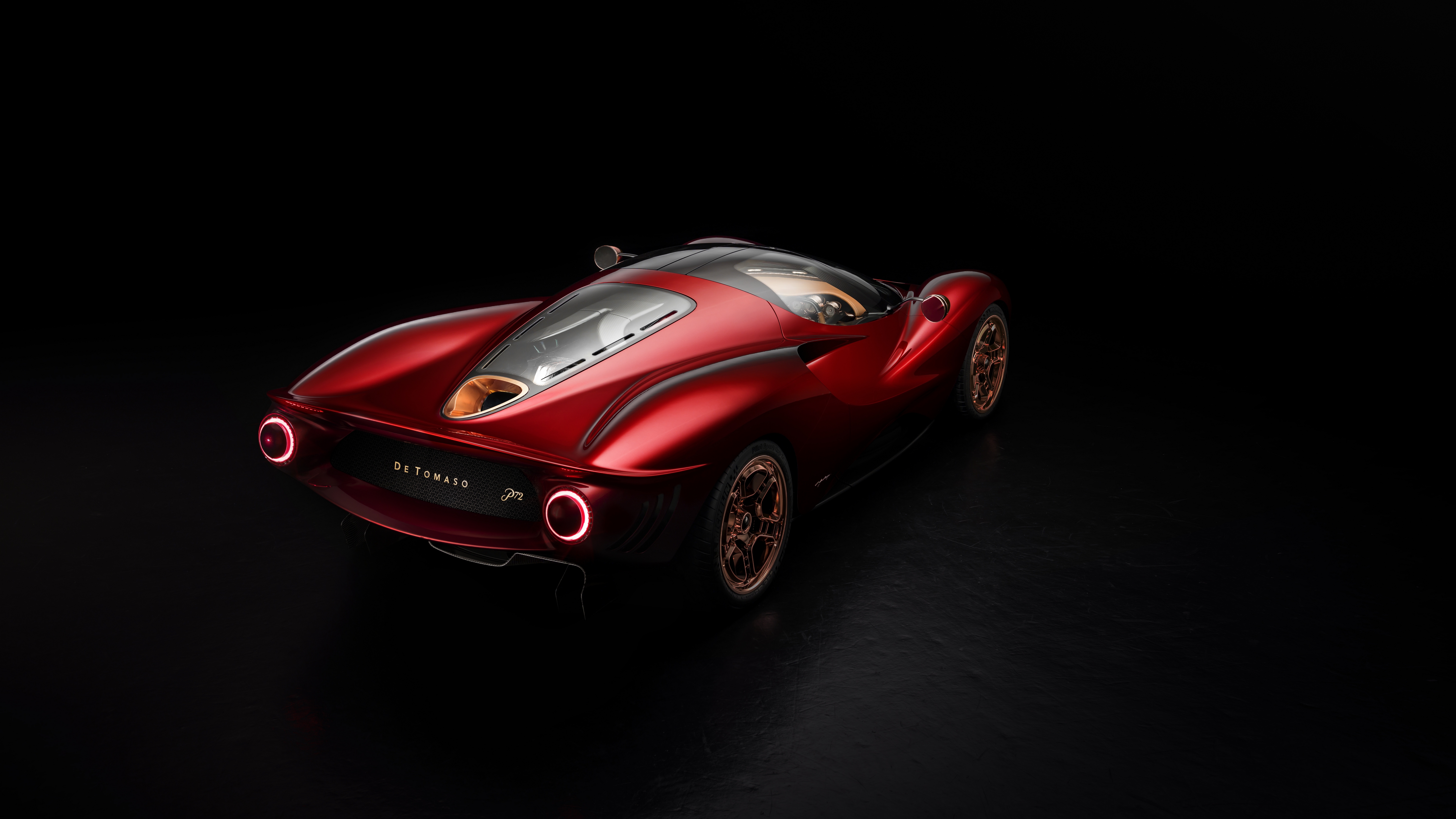 Description: A red sports car is shown in a dark room with a black background and a black background behind it.