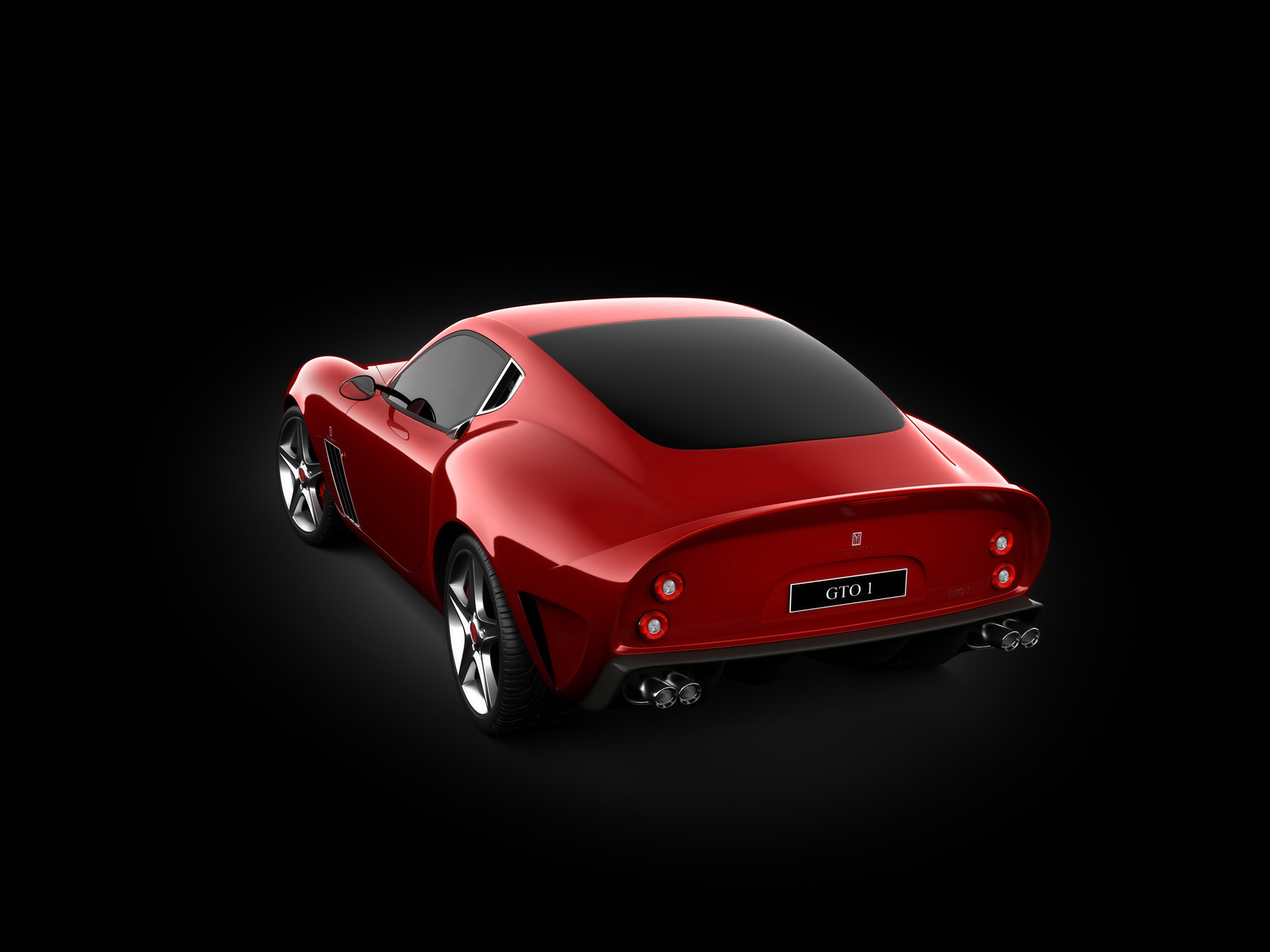 Description: A red sports car is shown in a dark room with a black background and a black background behind it.