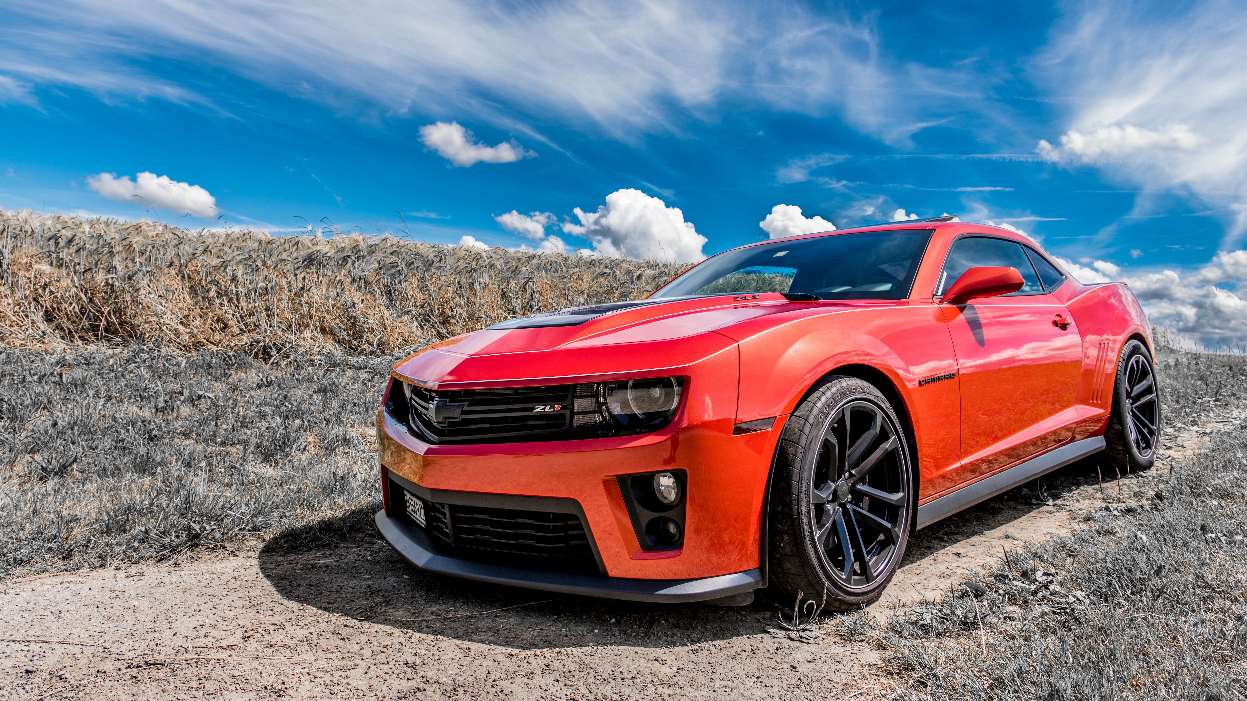 Description: A red sports car parked on a dirt road in the desert with a blue sky and clouds in the background.