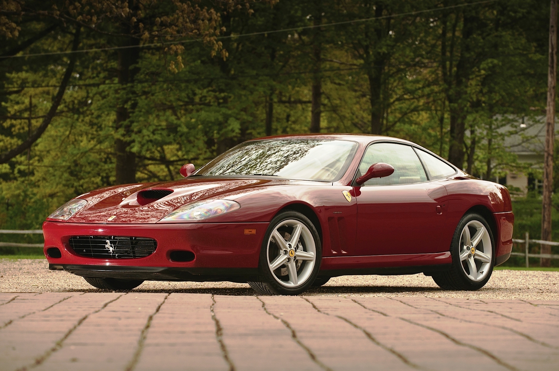 Description: A red sports car parked in a driveway next to a forest of trees and a fenced in area.