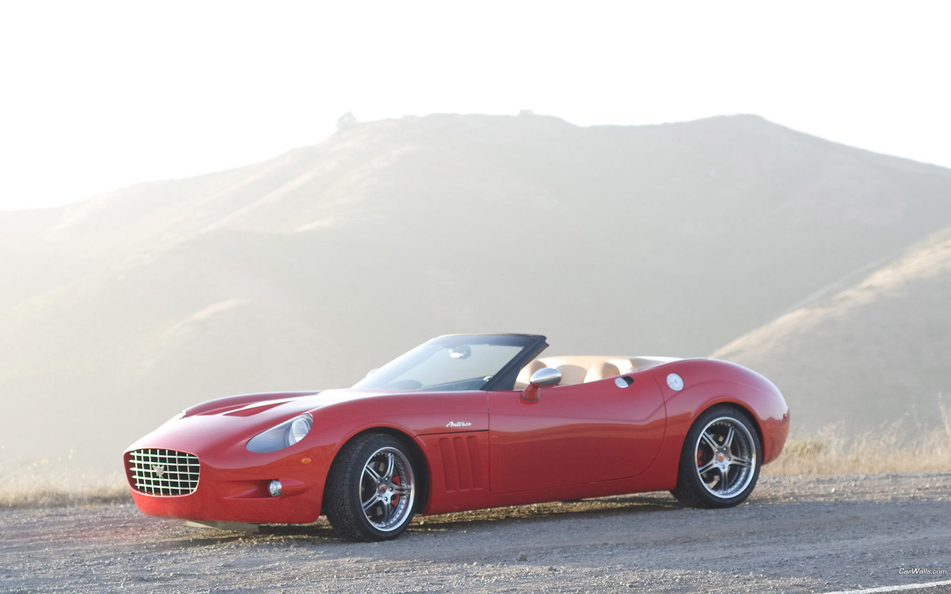 Description: A red sports car parked on the side of a road near a mountain range with a mountain in the background.