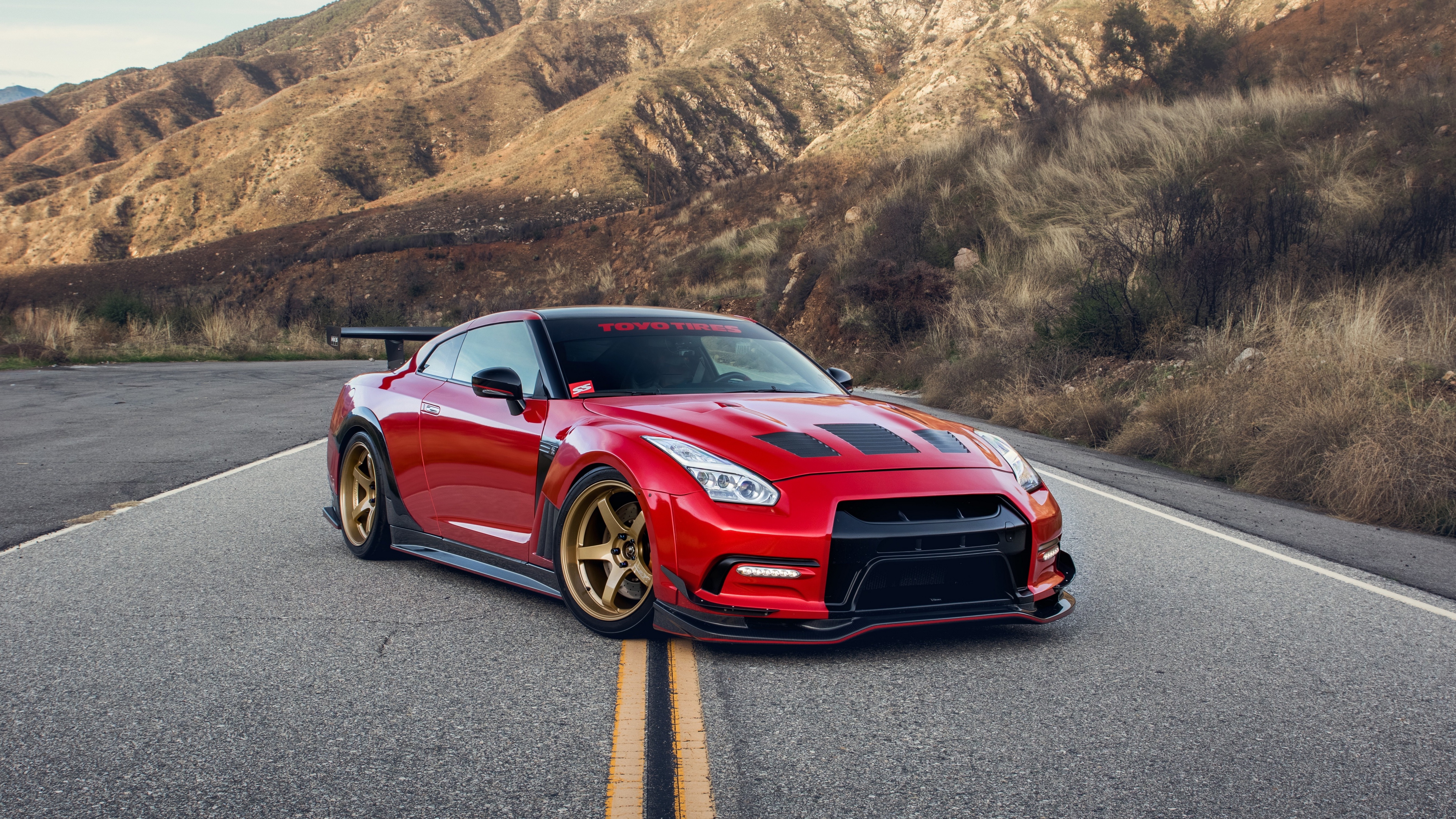 Description: A red sports car driving down a road in front of a mountain range with a mountain in the background.