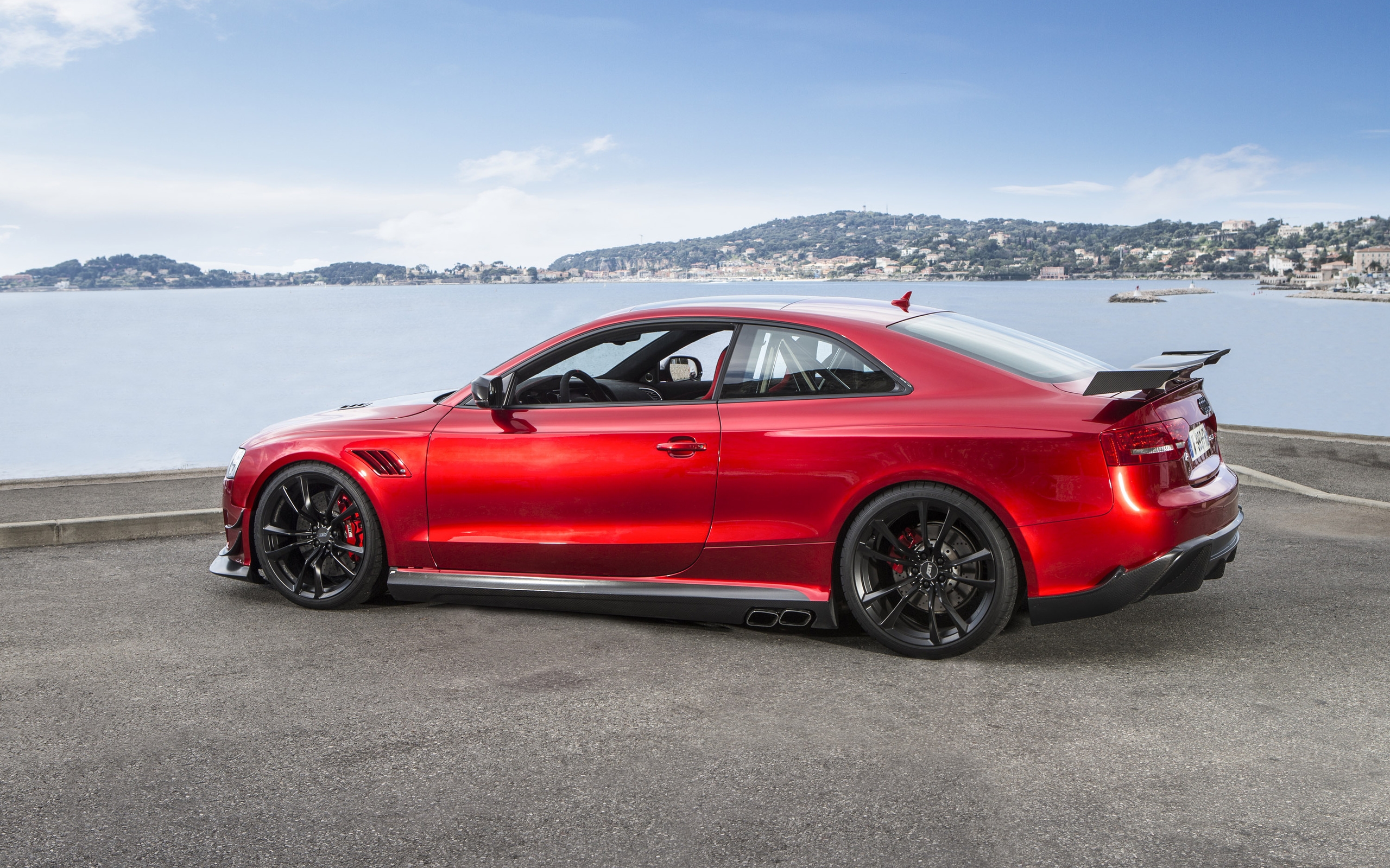 Description: A red sports car parked on the side of a road near a body of water with a mountain in the background.