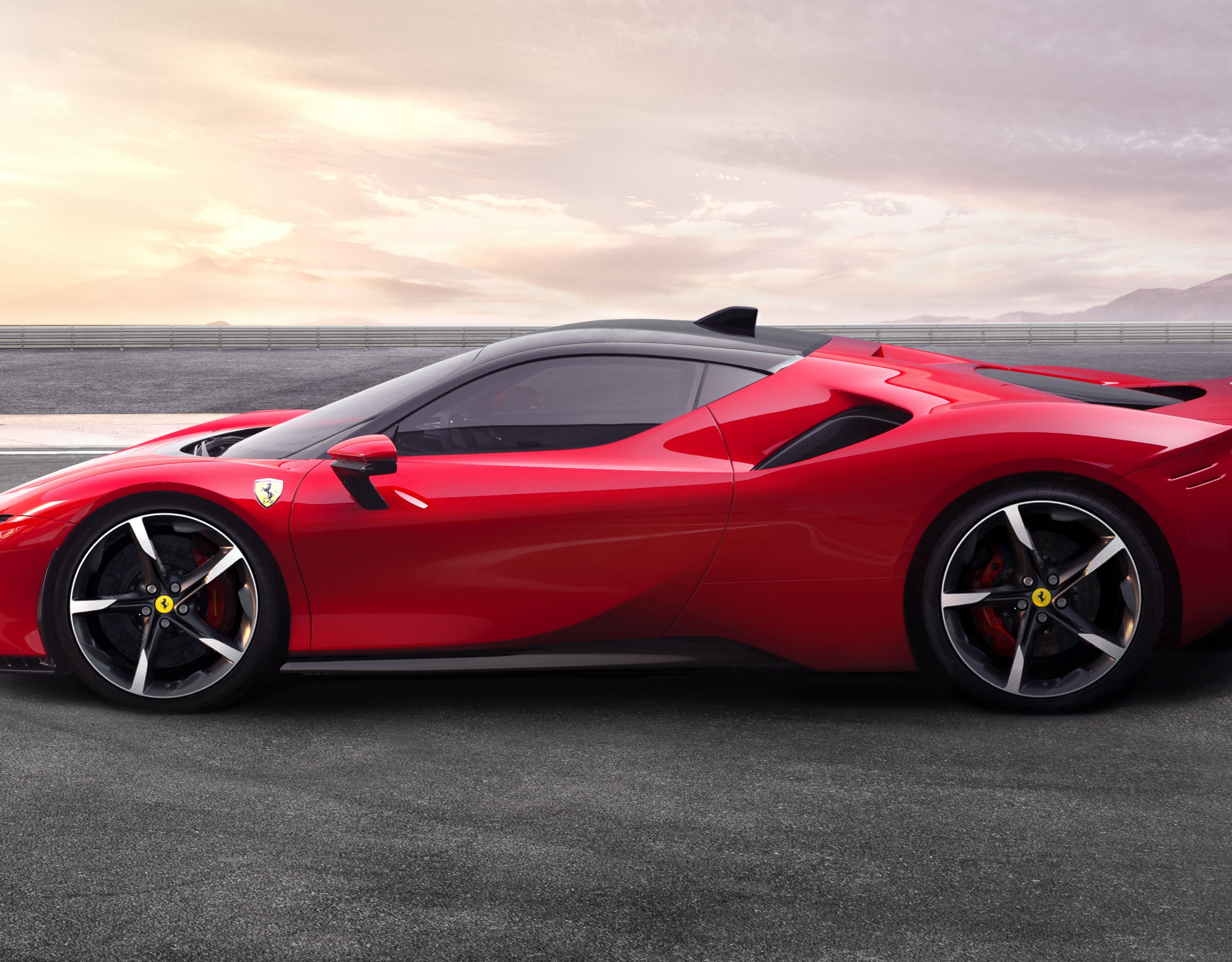 Description: A red sports car is parked on the road near a body of water and mountains in the background.