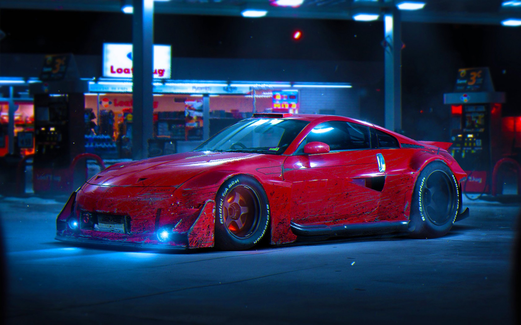Description: A red sports car parked in a parking lot at night time with neon lights on the tires and tires.