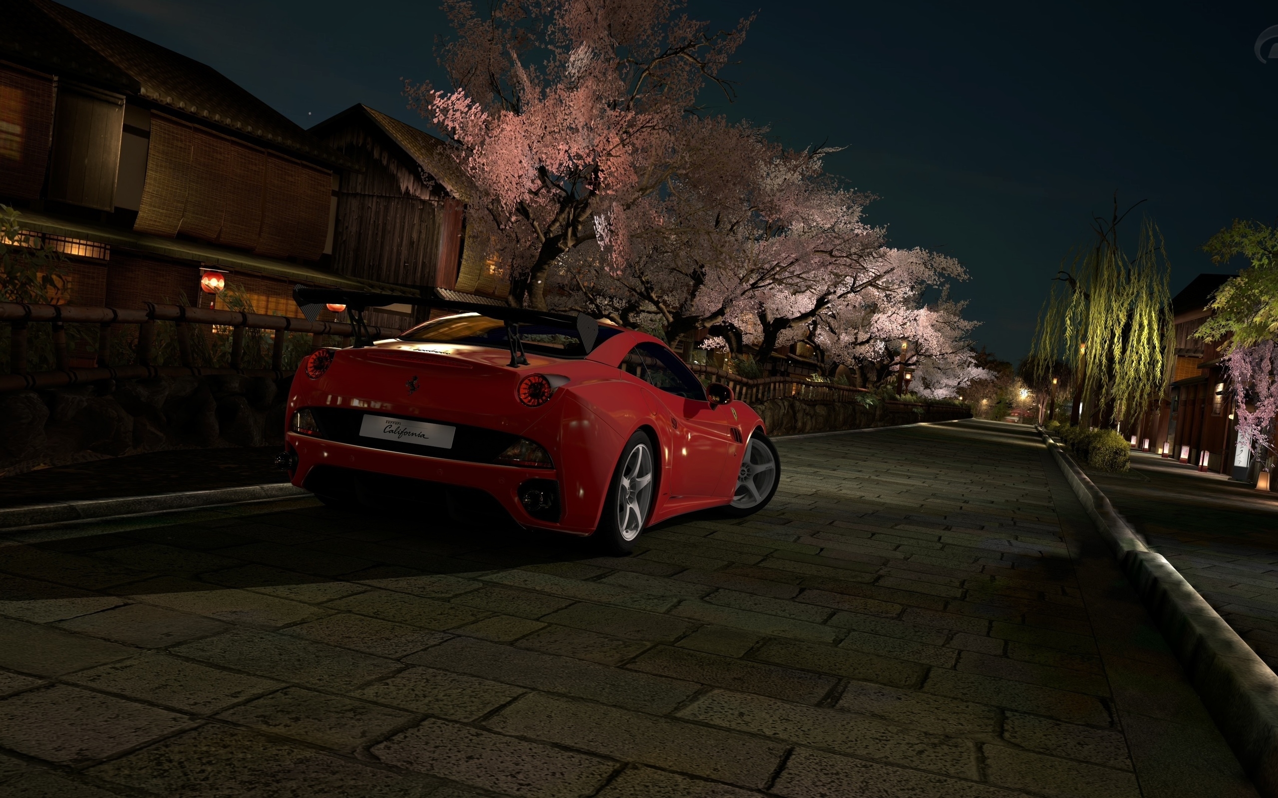 Description: A red sports car parked on a street at night with cherry blossoms on trees in the background and a dark sky.