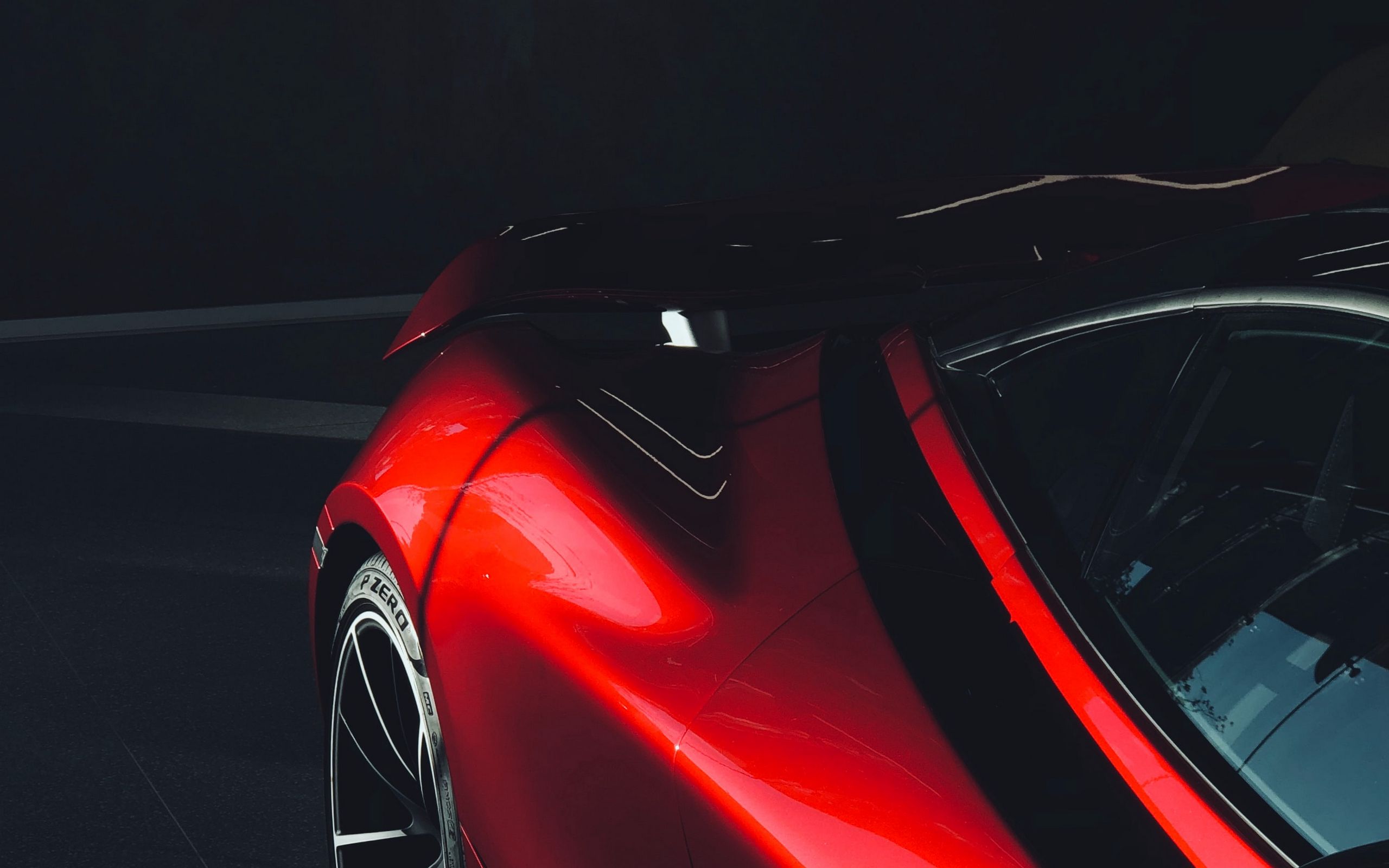 Description: A red sports car parked in a parking lot at night time with its hood up and the hood up.