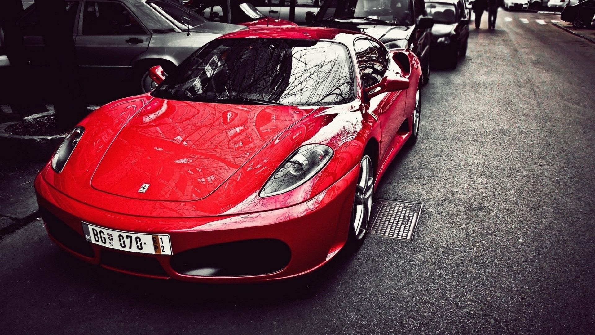 Description: A red sports car parked on the side of a road next to other cars on the street and people walking by.