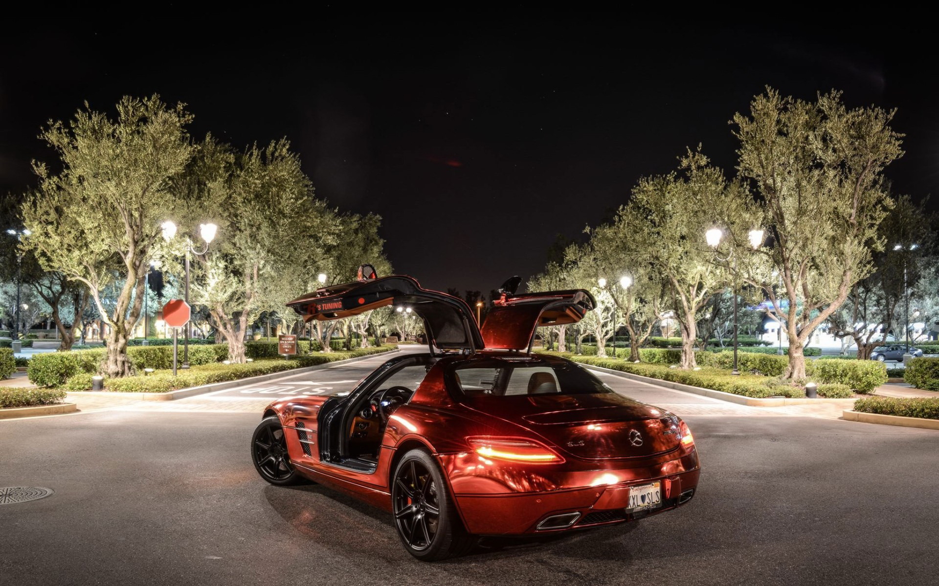 Description: A red sports car parked in a parking lot at night with its open doors open and a car trunk open.