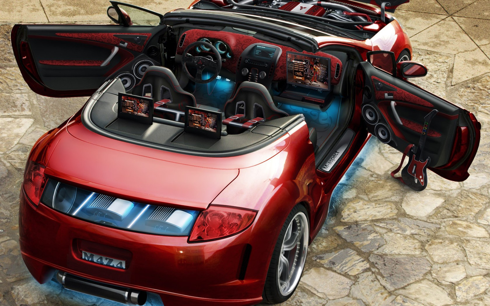 Description: A red sports car with its doors open and a hatchback open and the interior of the car is shown.