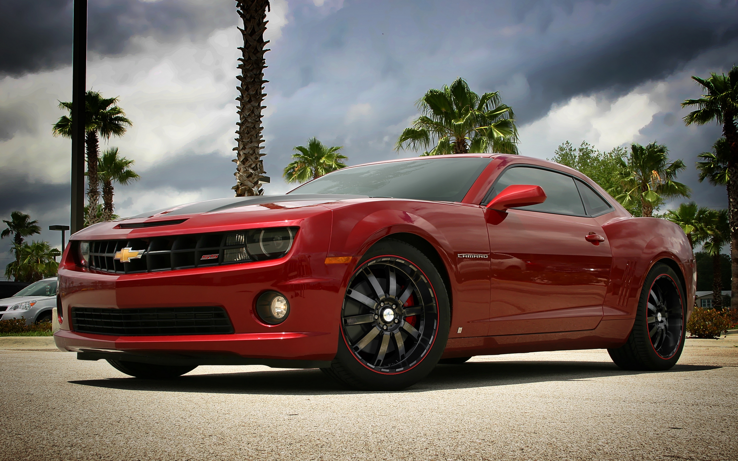 Description: A red sports car parked in a parking lot with palm trees in the background and a cloudy sky with dark clouds.