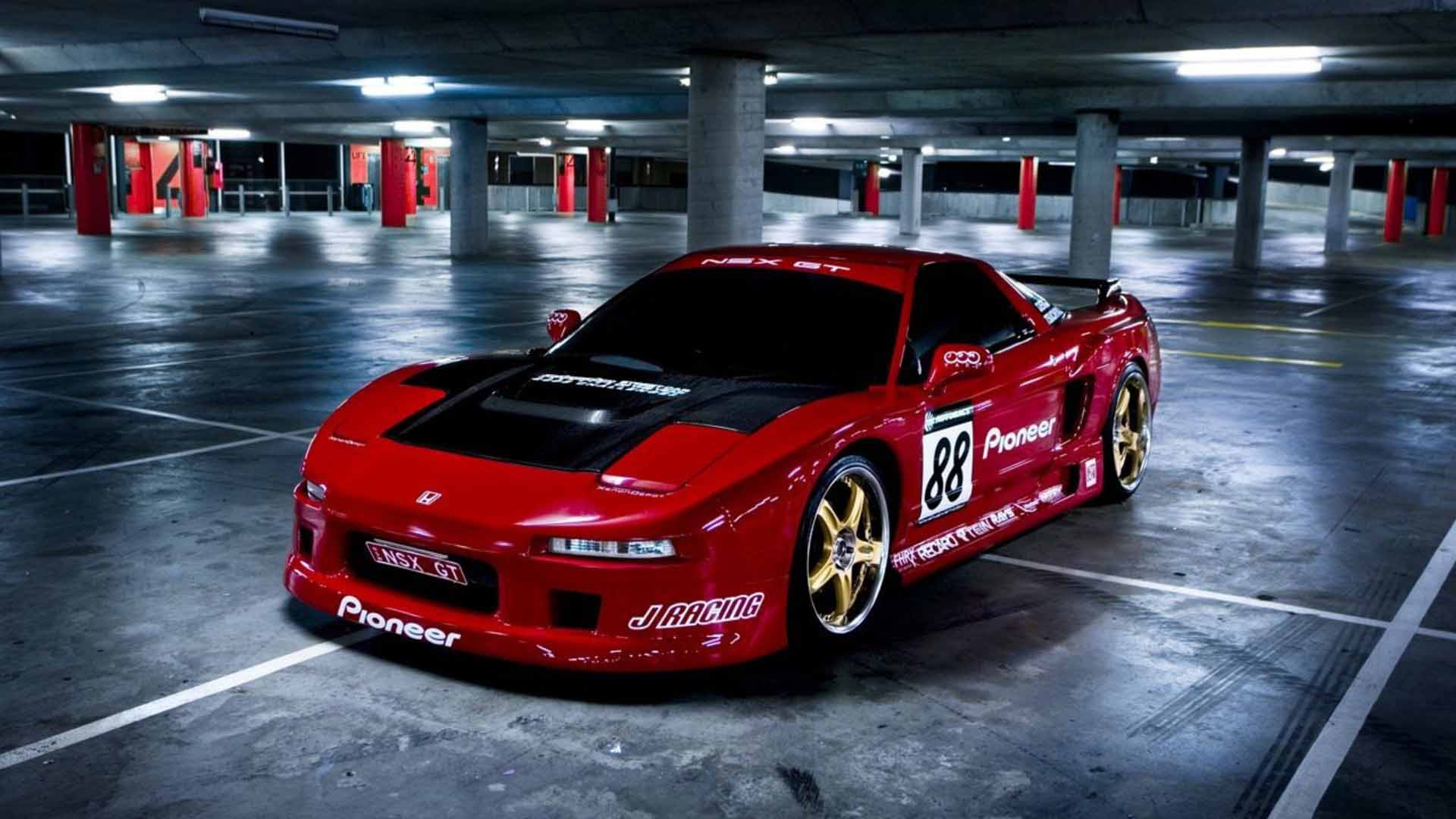 Description: A red sports car parked in a parking garage with red and white pillars and red and black stripes on the hood.