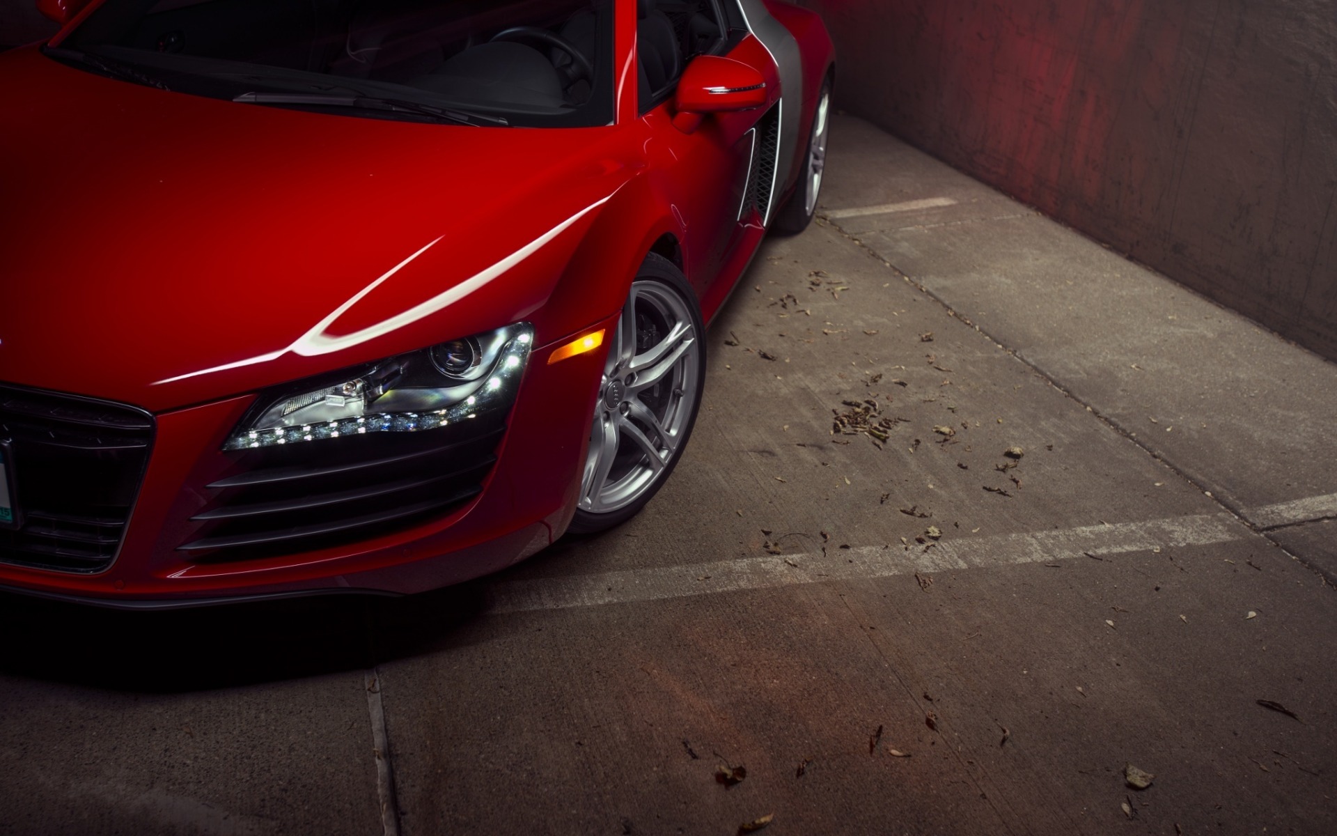 Description: A red sports car parked in a parking lot next to a wall with a light on it's headlight.