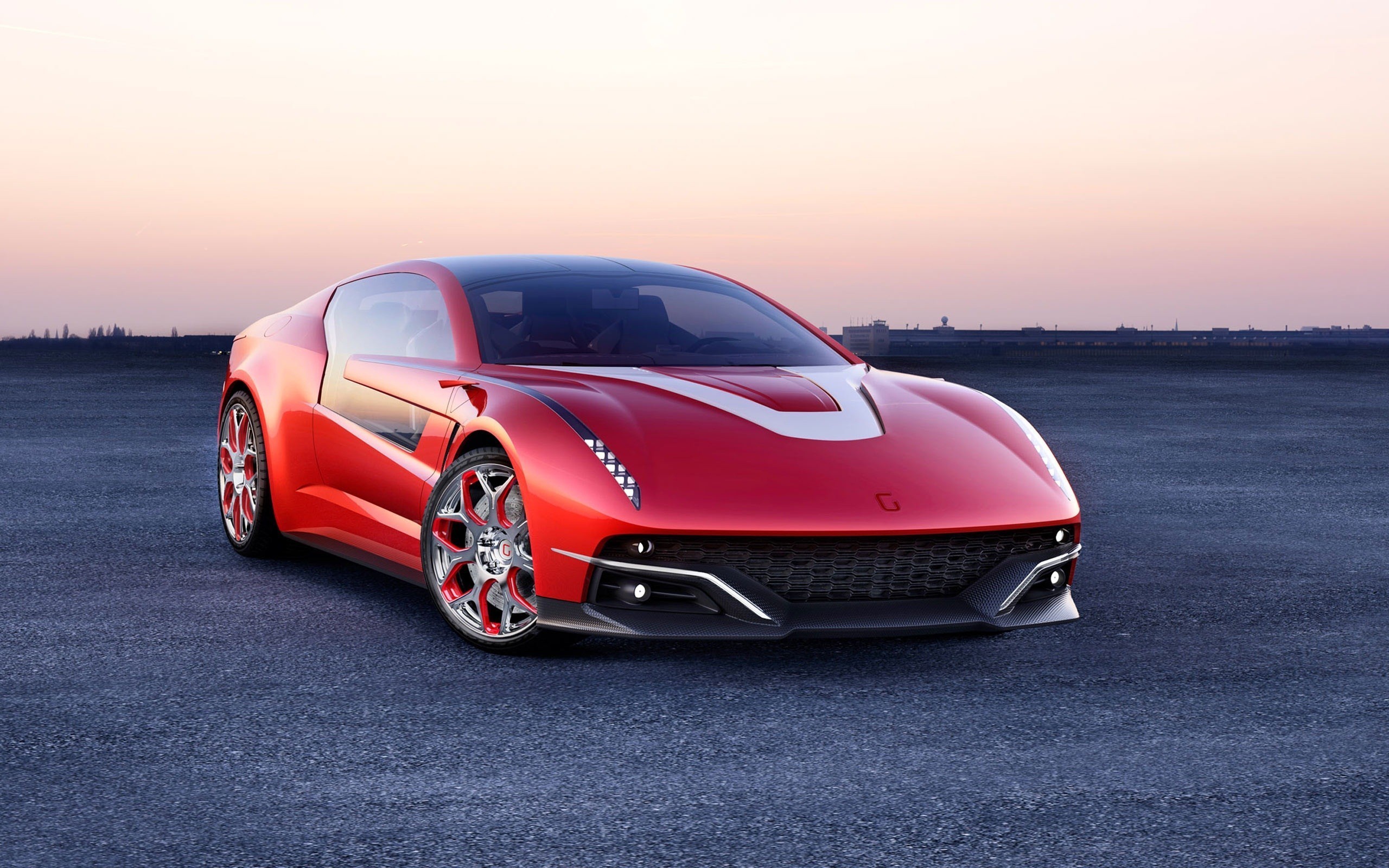 Description: A red sports car parked in a parking lot at sunset or dawn with a pink sky in the background.