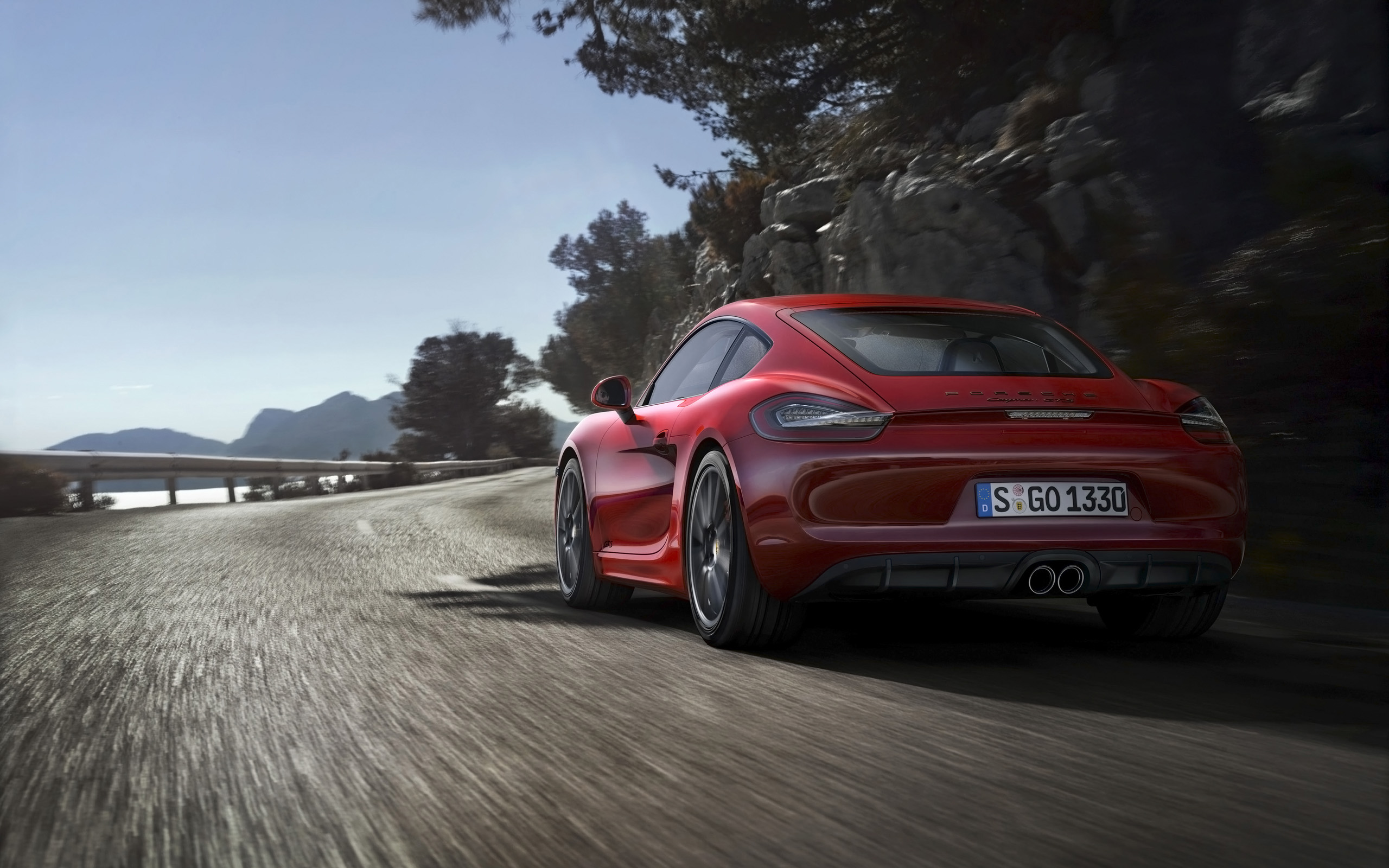Description: A red sports car driving down a road next to a forest and a bridge in the background with a blue sky.