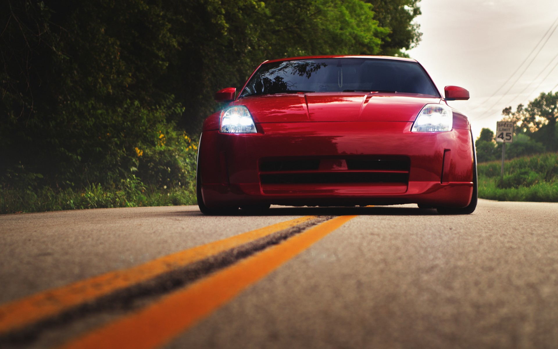 Description: A red sports car driving down a road next to trees and grass on a sunny day with a blue sky.