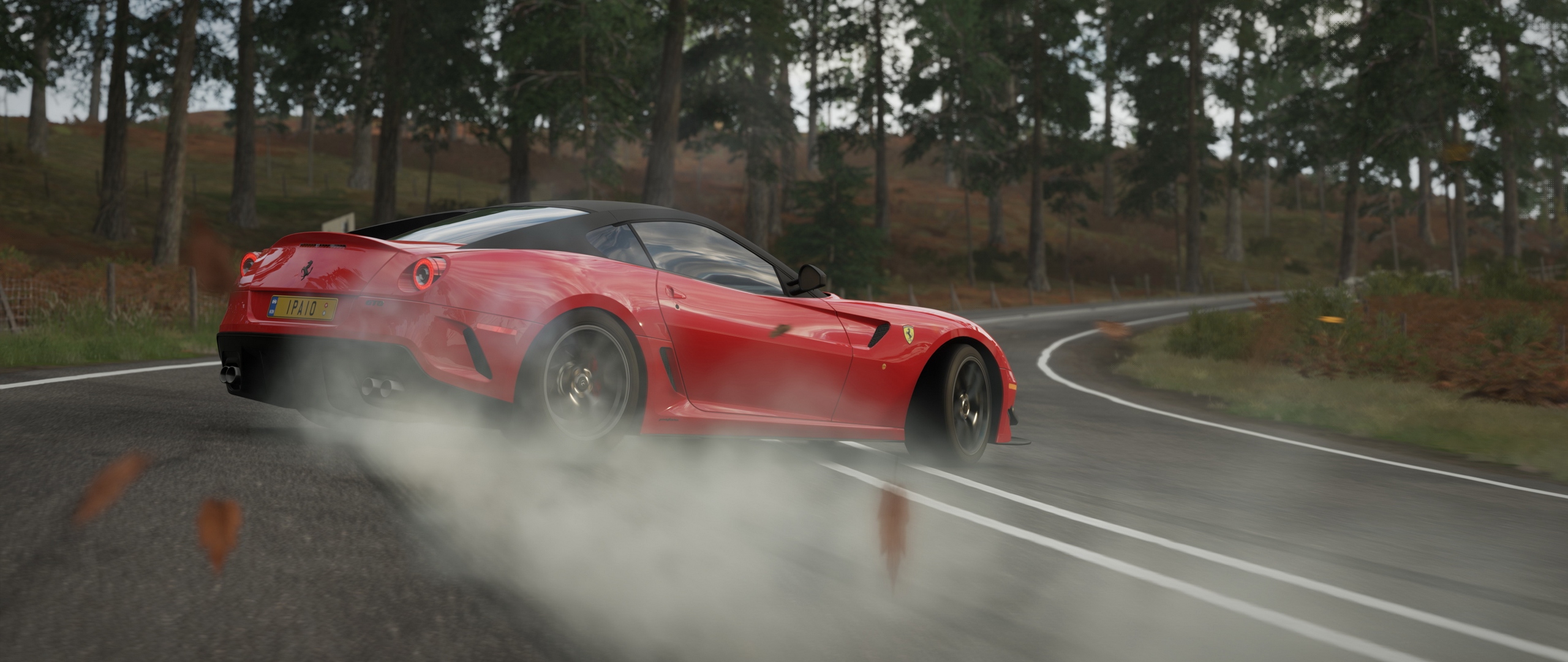 Description: A red sports car driving down a road with smoke coming out of the hood and the hood down on it.