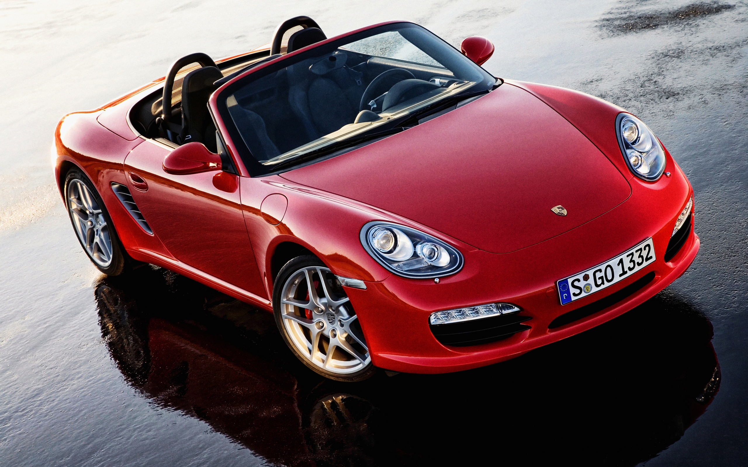 Description: A red sports car parked on a wet beach next to the ocean with its top down and the roof down.