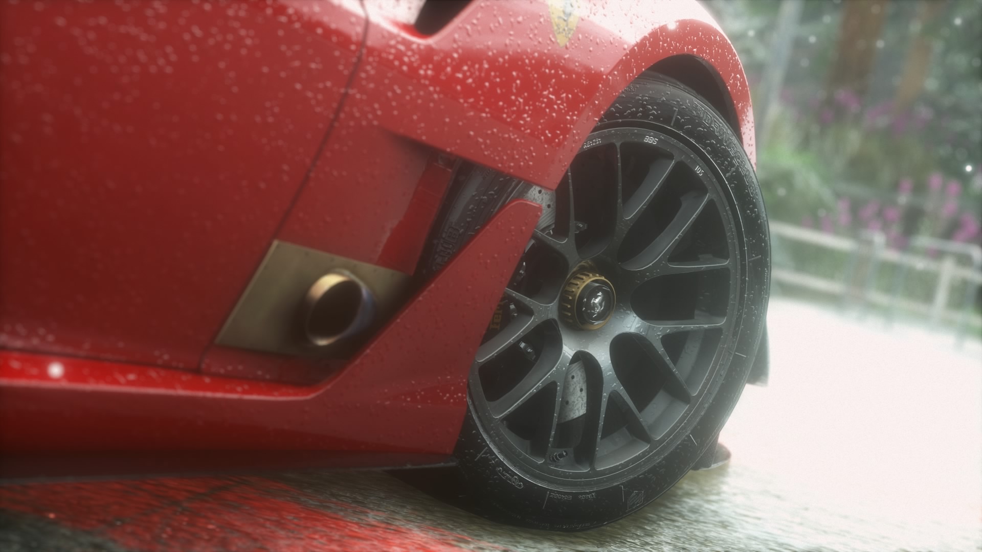 Description: A red sports car parked on a wet road in the rain with a yellow brake pad on the front.