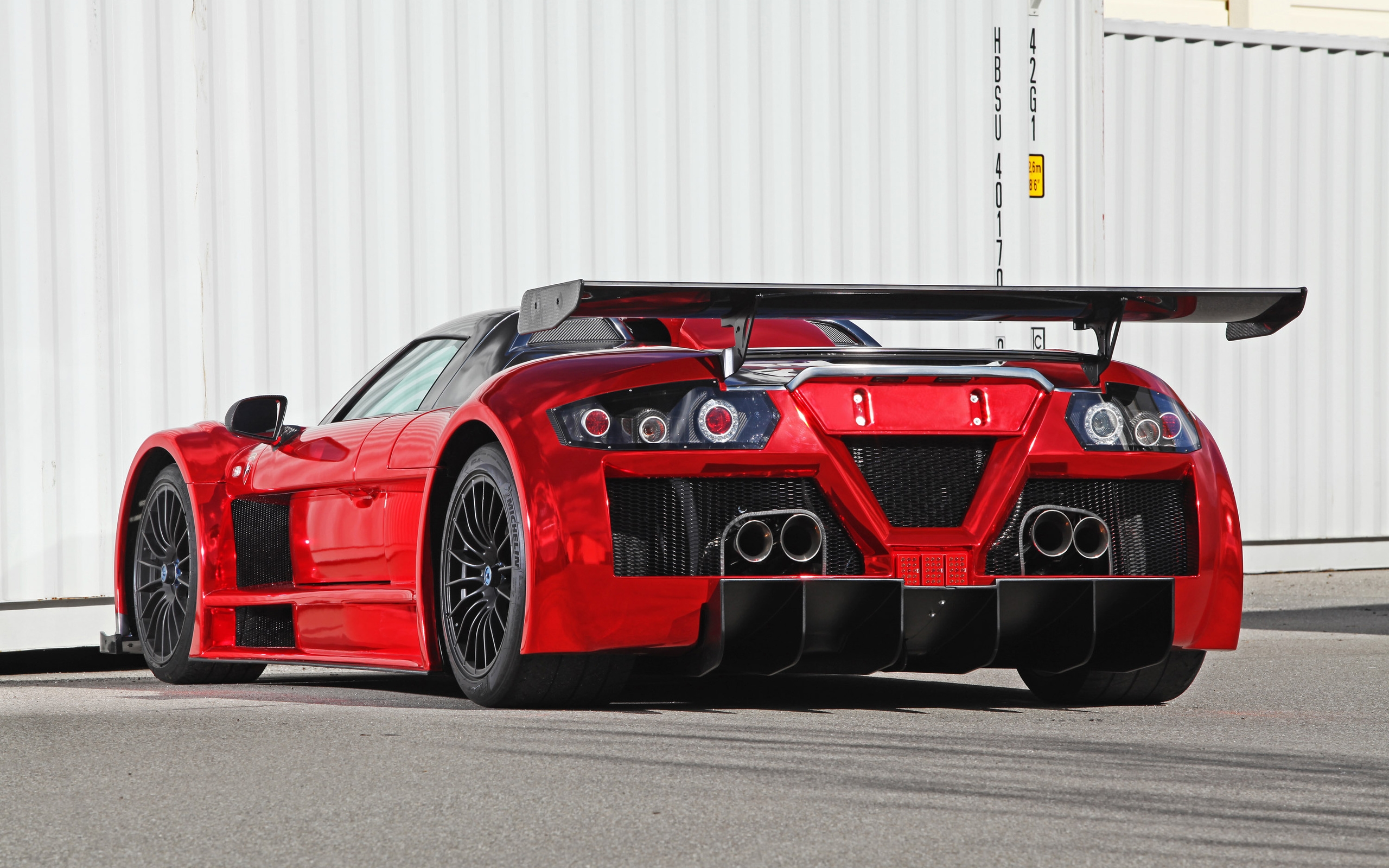 Description: A red sports car parked in front of a white building with a white wall behind it and a white building behind it.