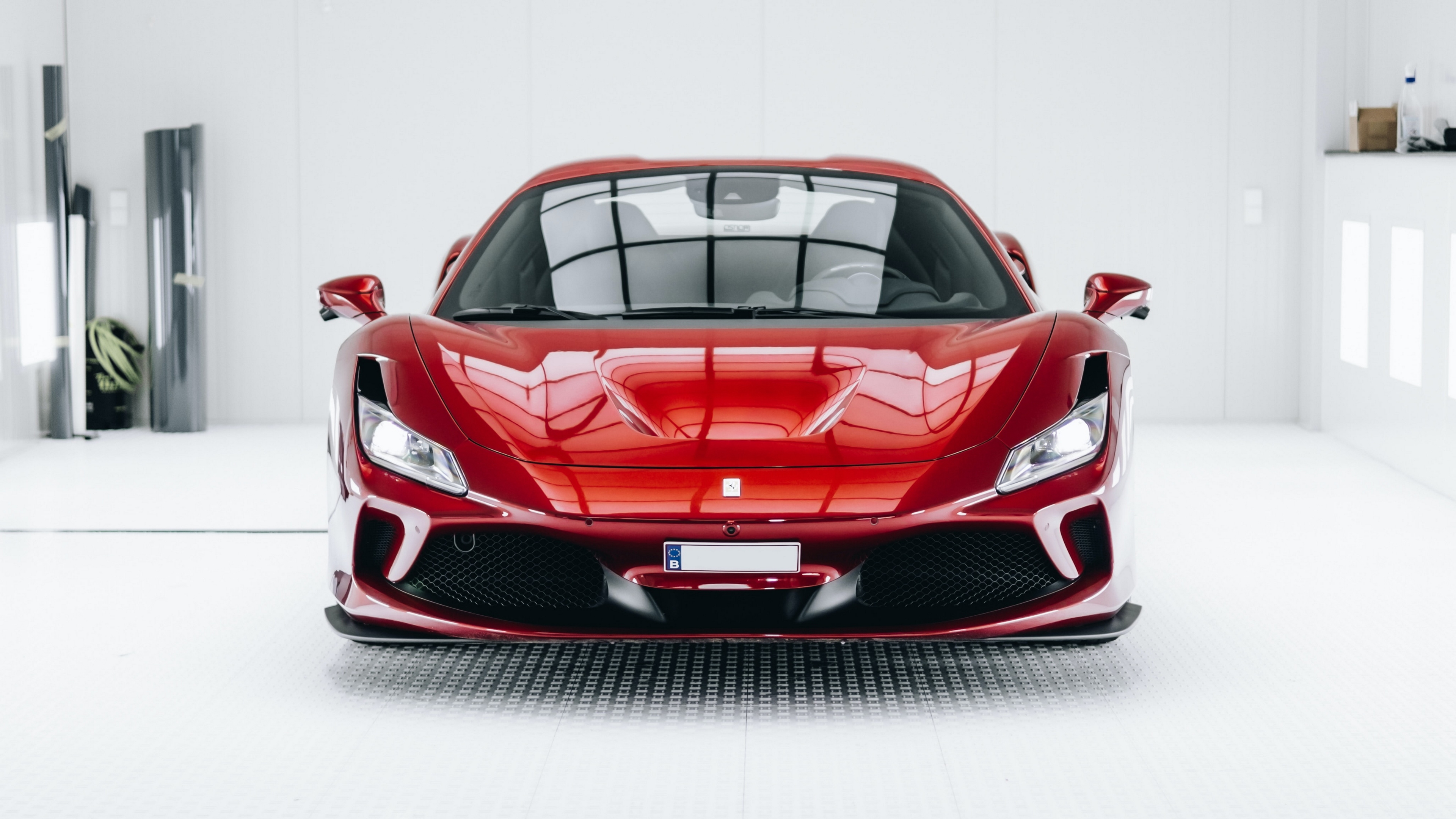 Description: A red sports car parked in a white room with a black door and window on the side of the car.