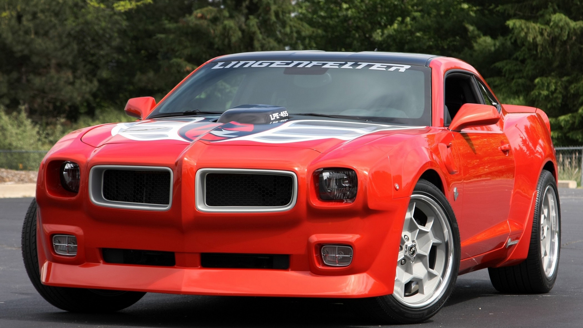 Description: A red sports car with a white stripe on it's hood and hood stripes on it's hood.