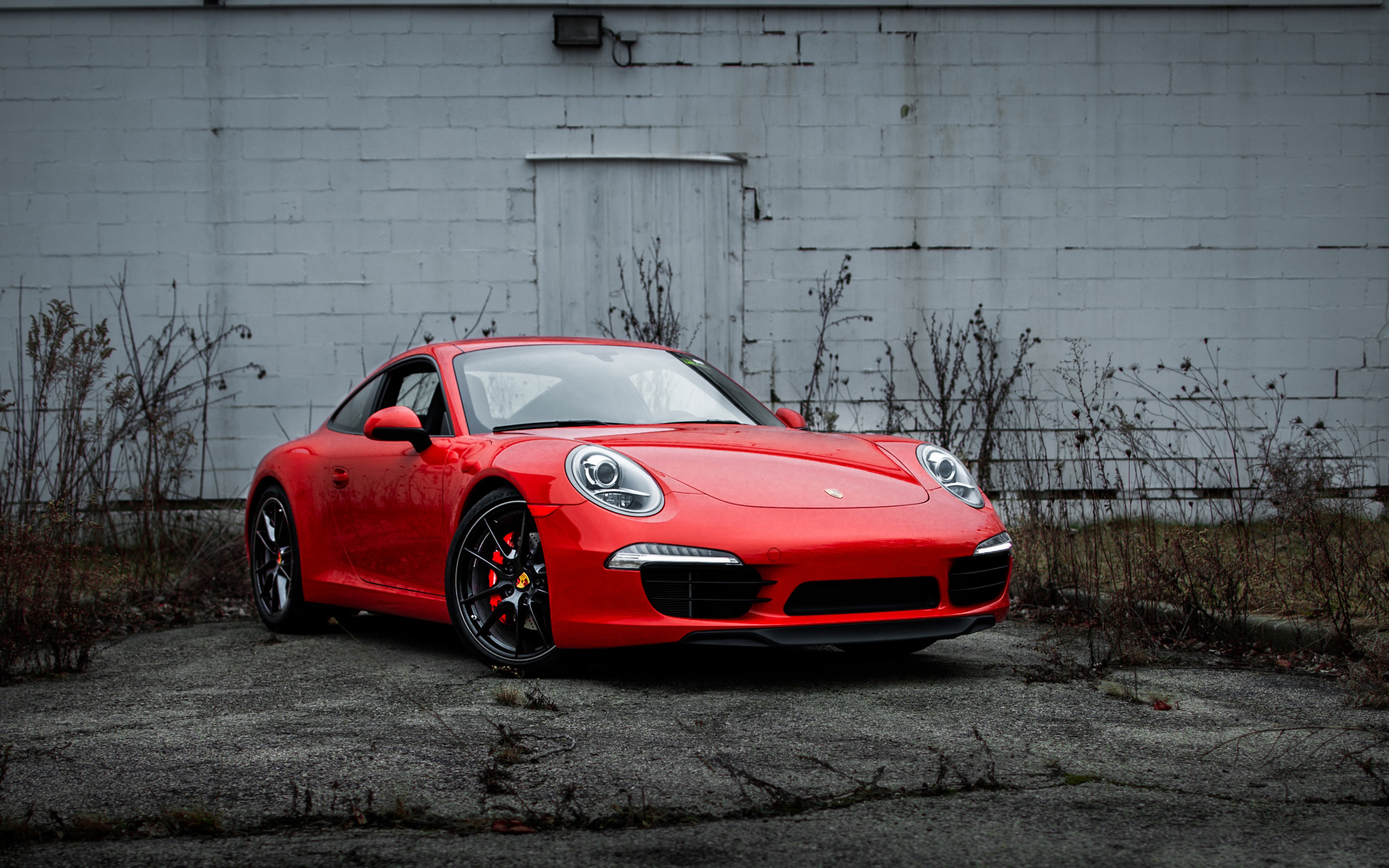 Description: A red sports car parked in front of a building with a white wall behind it and a black rim.