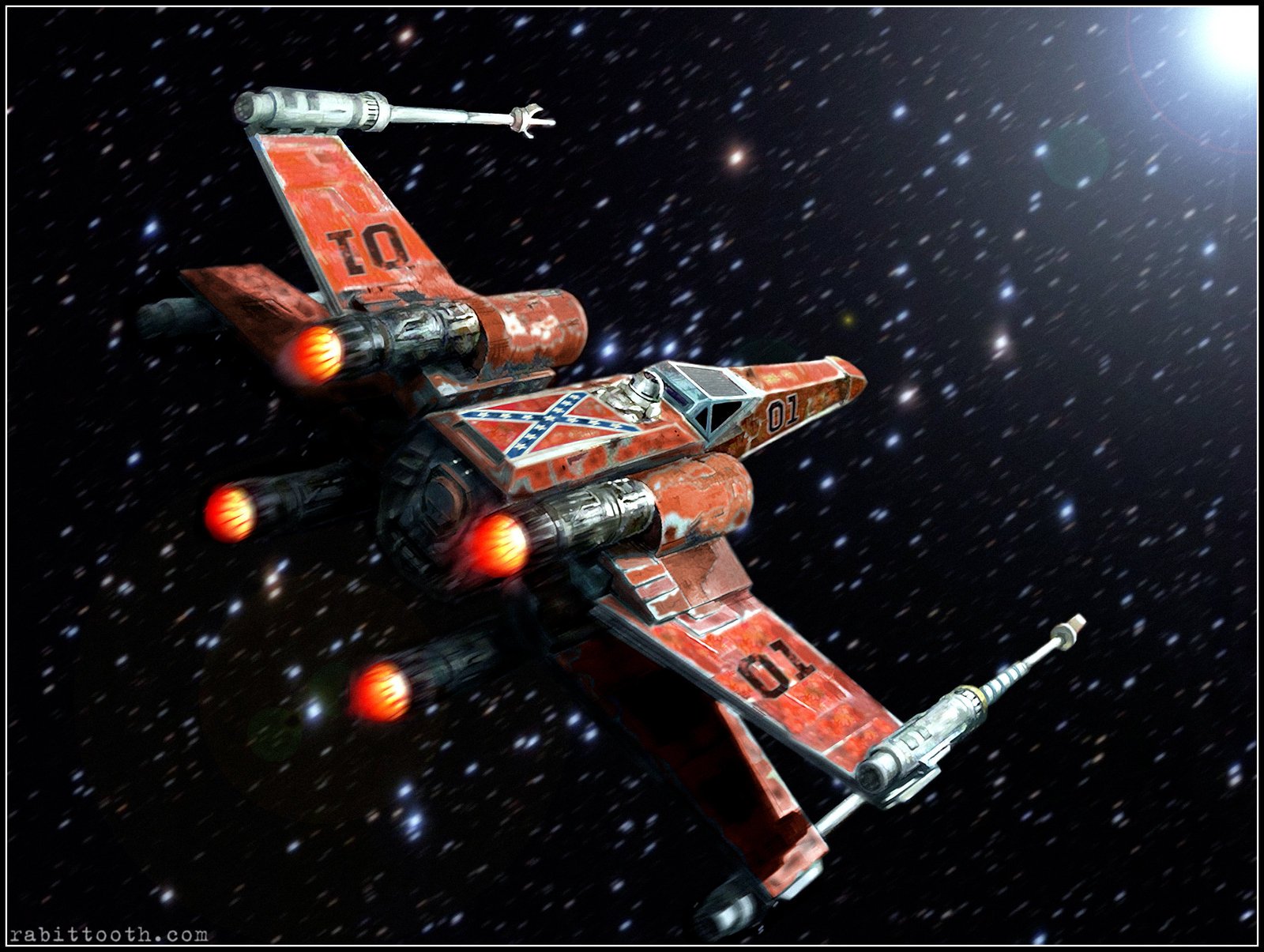 Description: A red starfighter fighter plane flying through the sky with a star in the background and a red light on the bottom of the plane.