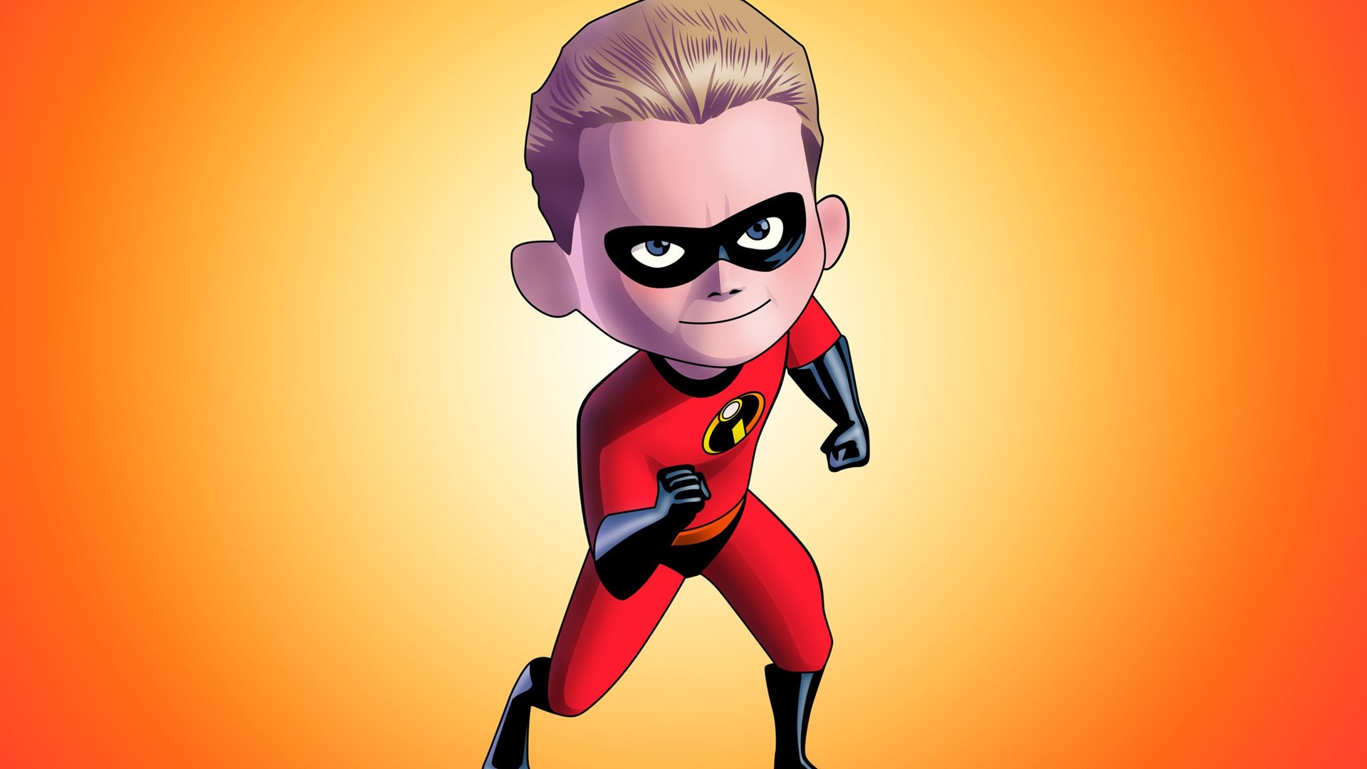 Description: A cartoon of a man in a red suit and mask running with a yellow background behind him and a red background behind him.