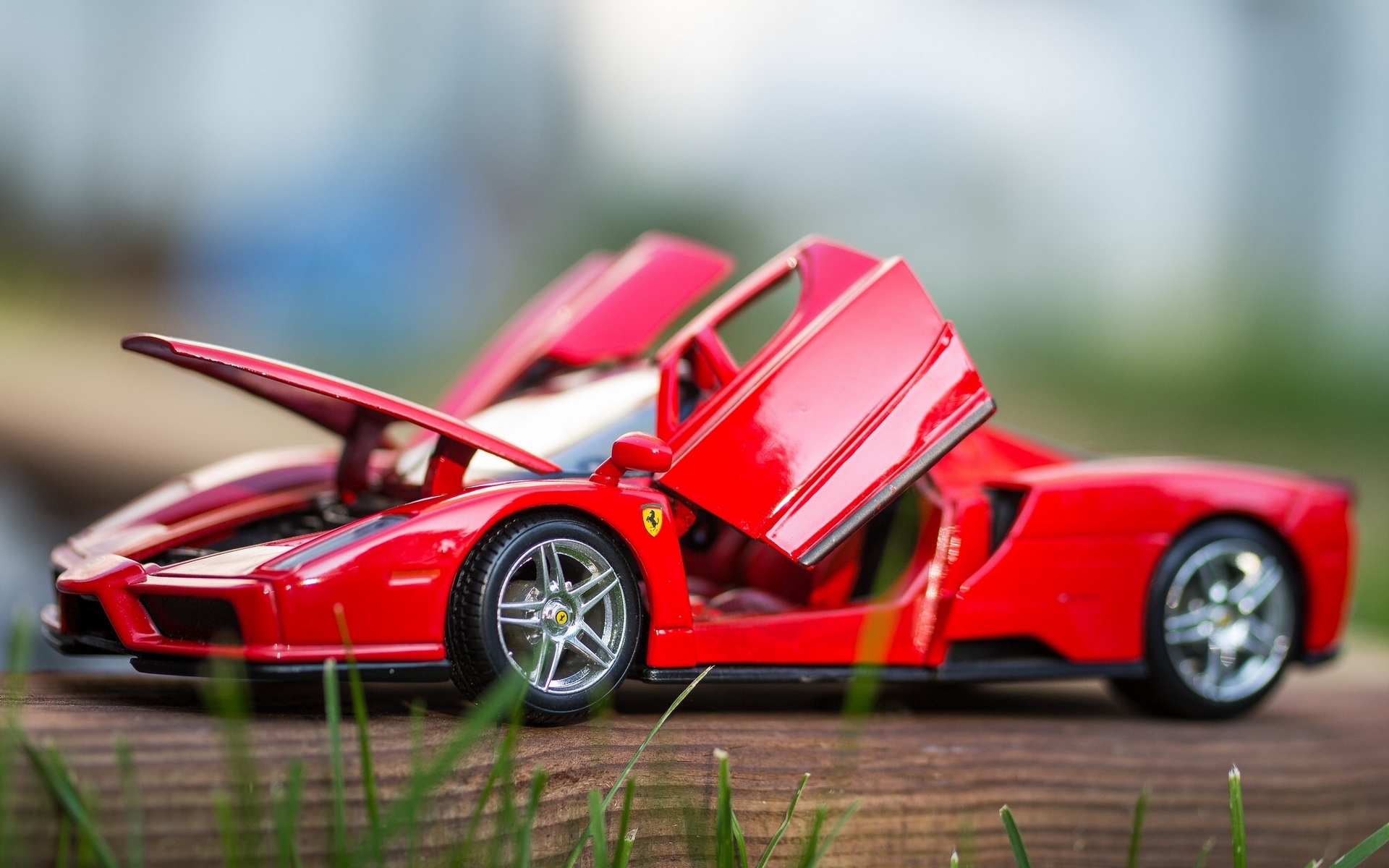 Description: A red toy car with open doors on a wooden table with grass and a building in the background in the daytime.