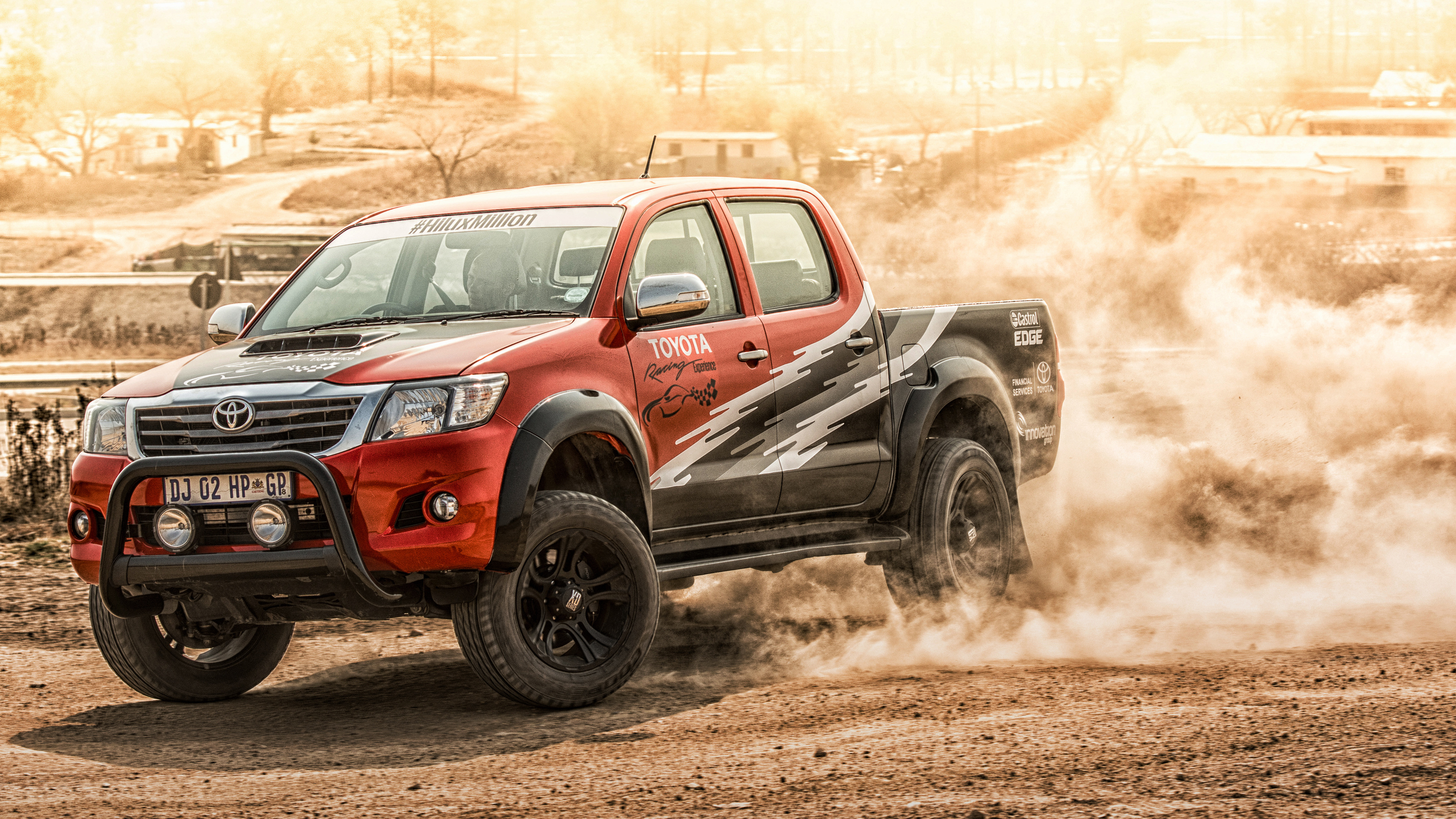 Description: A red truck driving down a dirt road next to a forest of trees and bushes with a sky background.