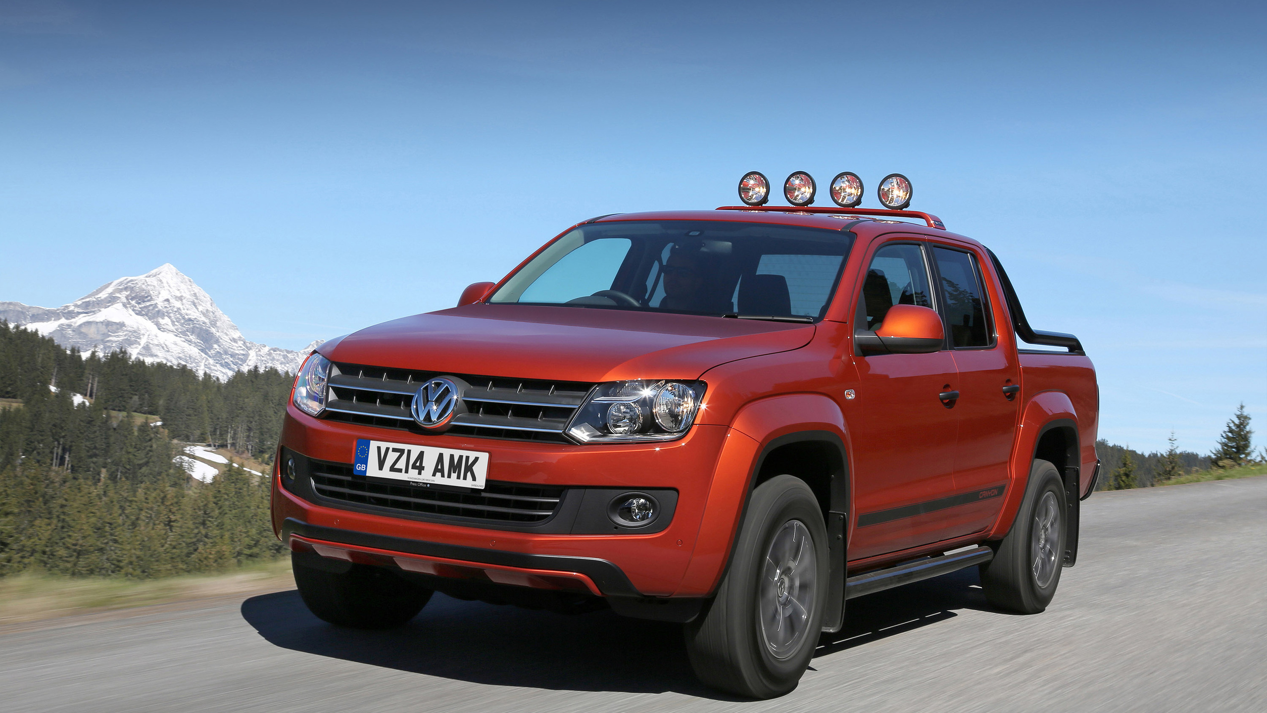 Description: A red truck driving down a road with mountains in the background and a blue sky with clouds in the background.