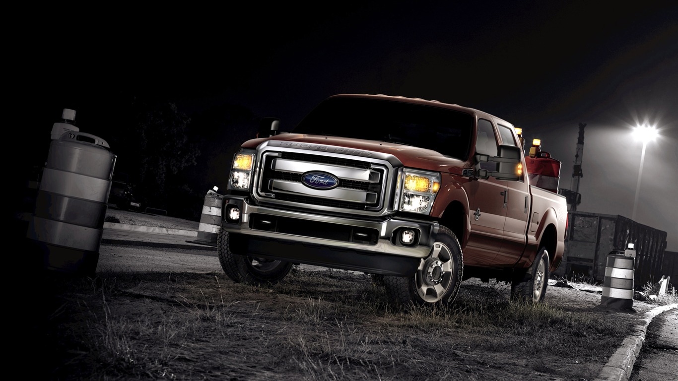 Description: A red truck parked on a street at night with lights on the side of it and a barrel of beer in the back.