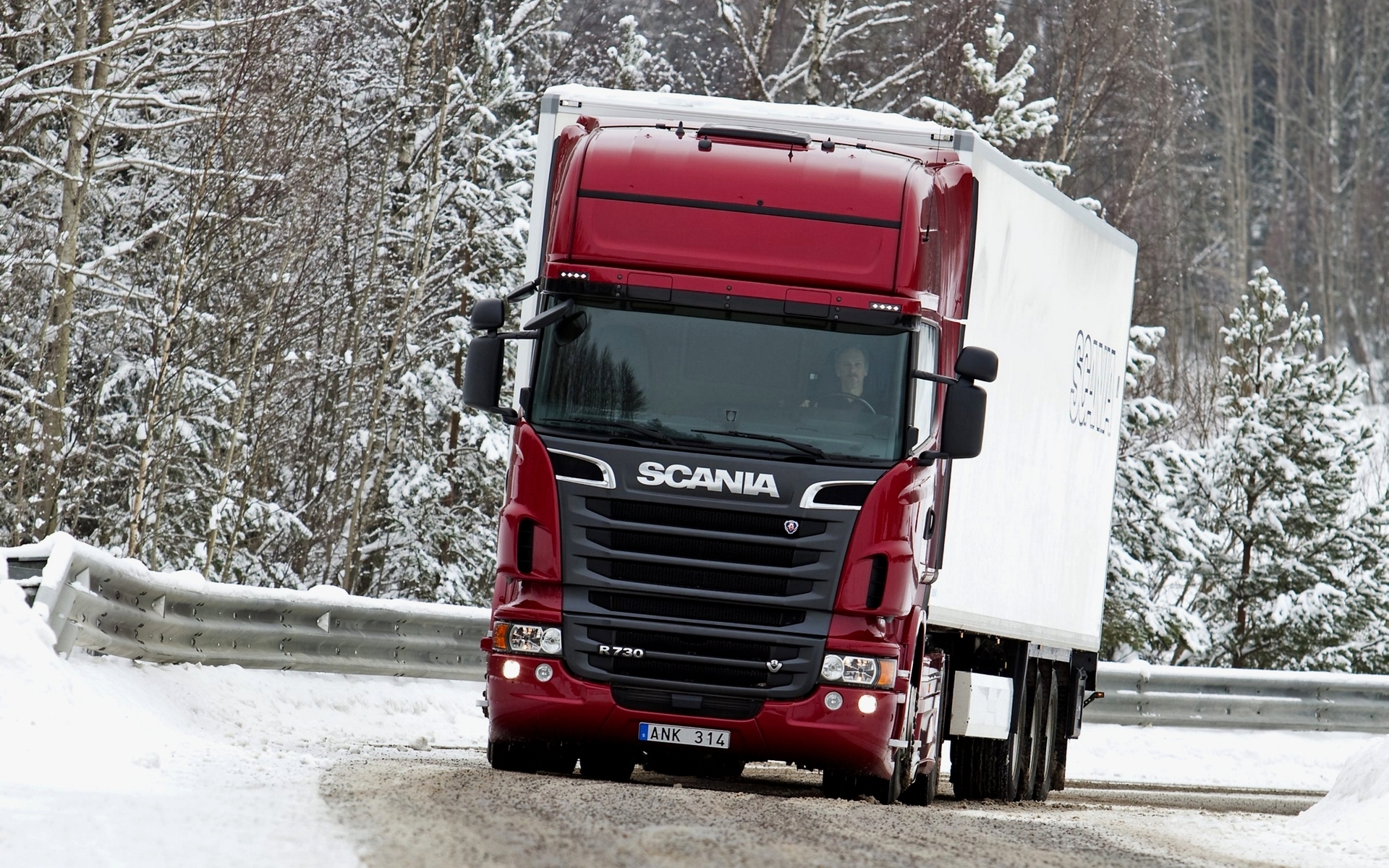 Description: A red truck driving down a snowy road next to a forest of trees and bushes with snow on the ground.