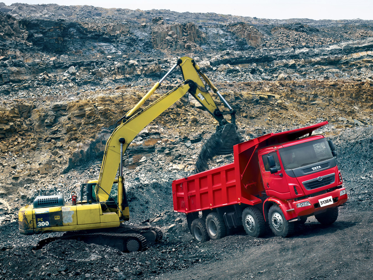 Description: A red truck is parked next to a yellow truck on a dirt road with a yellow bulldozer.