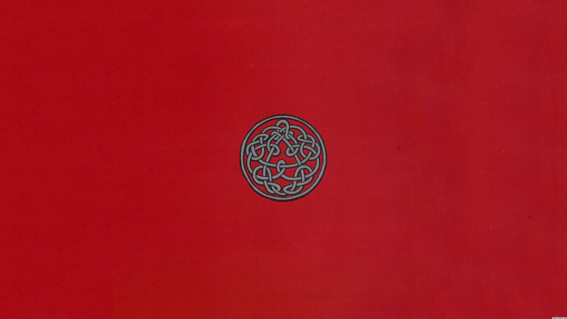 Description: A red wall with a black and white design on it and a red background with a black circle on the wall.