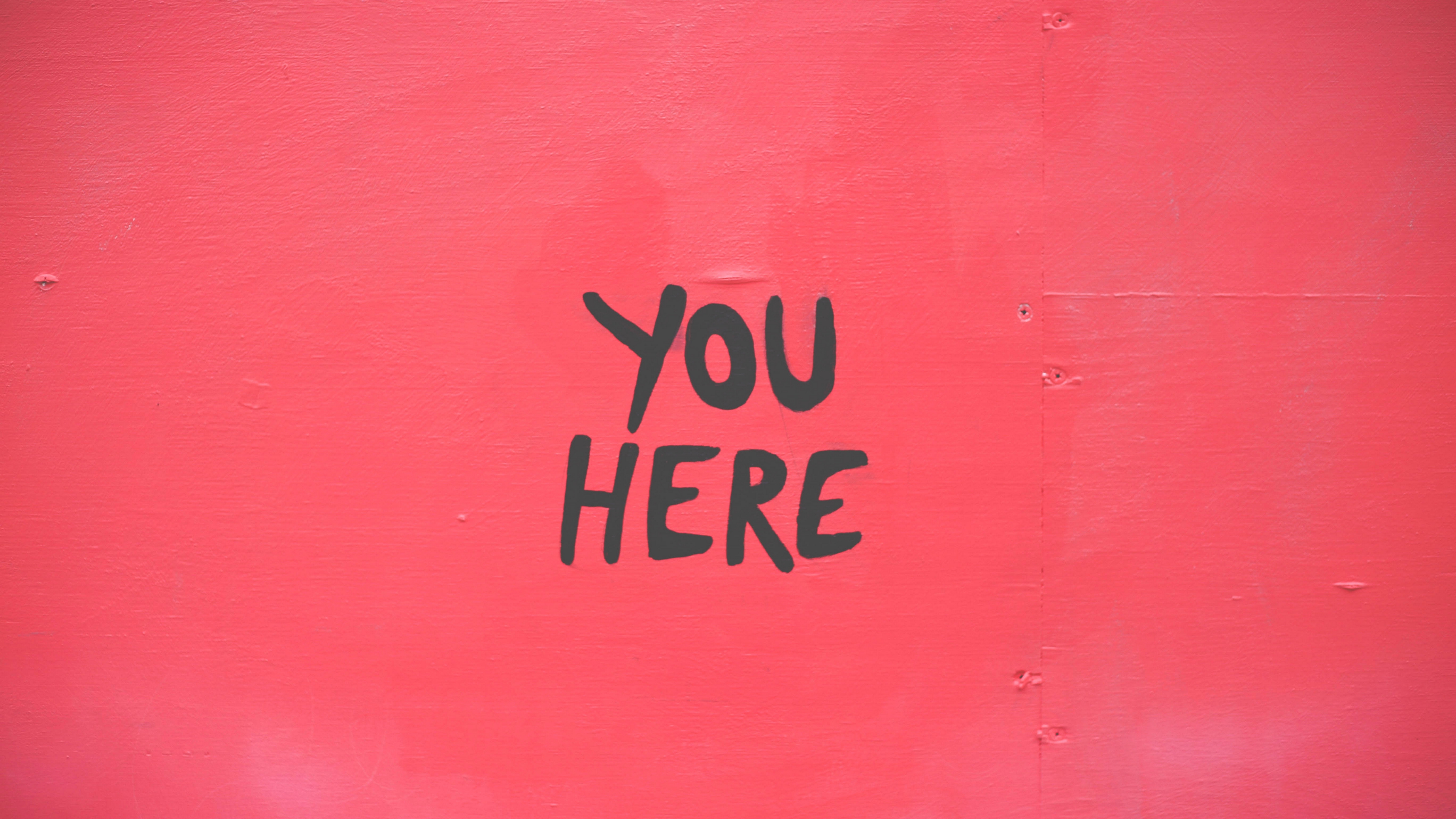 Description: A red wall with a black you here written on it and a stop sign in the middle of the wall.