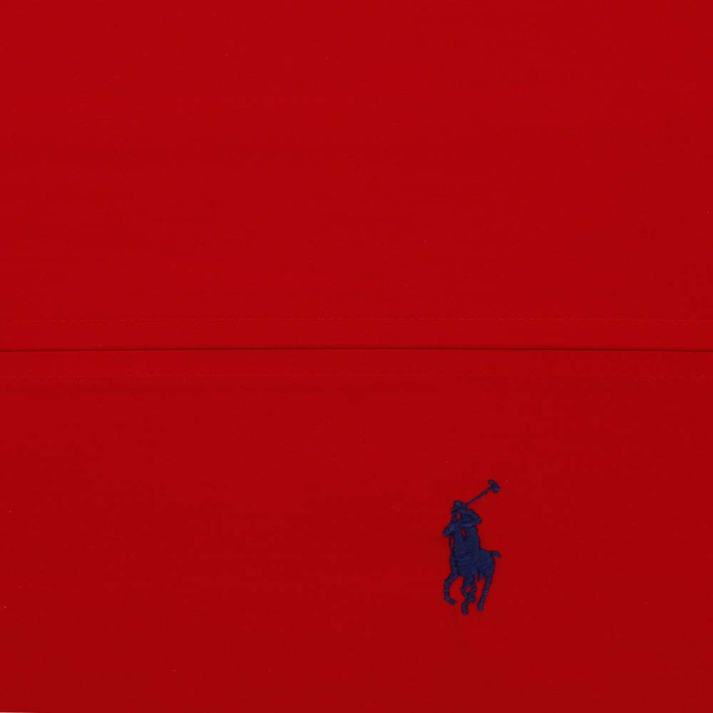 Description: A red wall with a blue horse on it's side and a person on the other side of the wall.