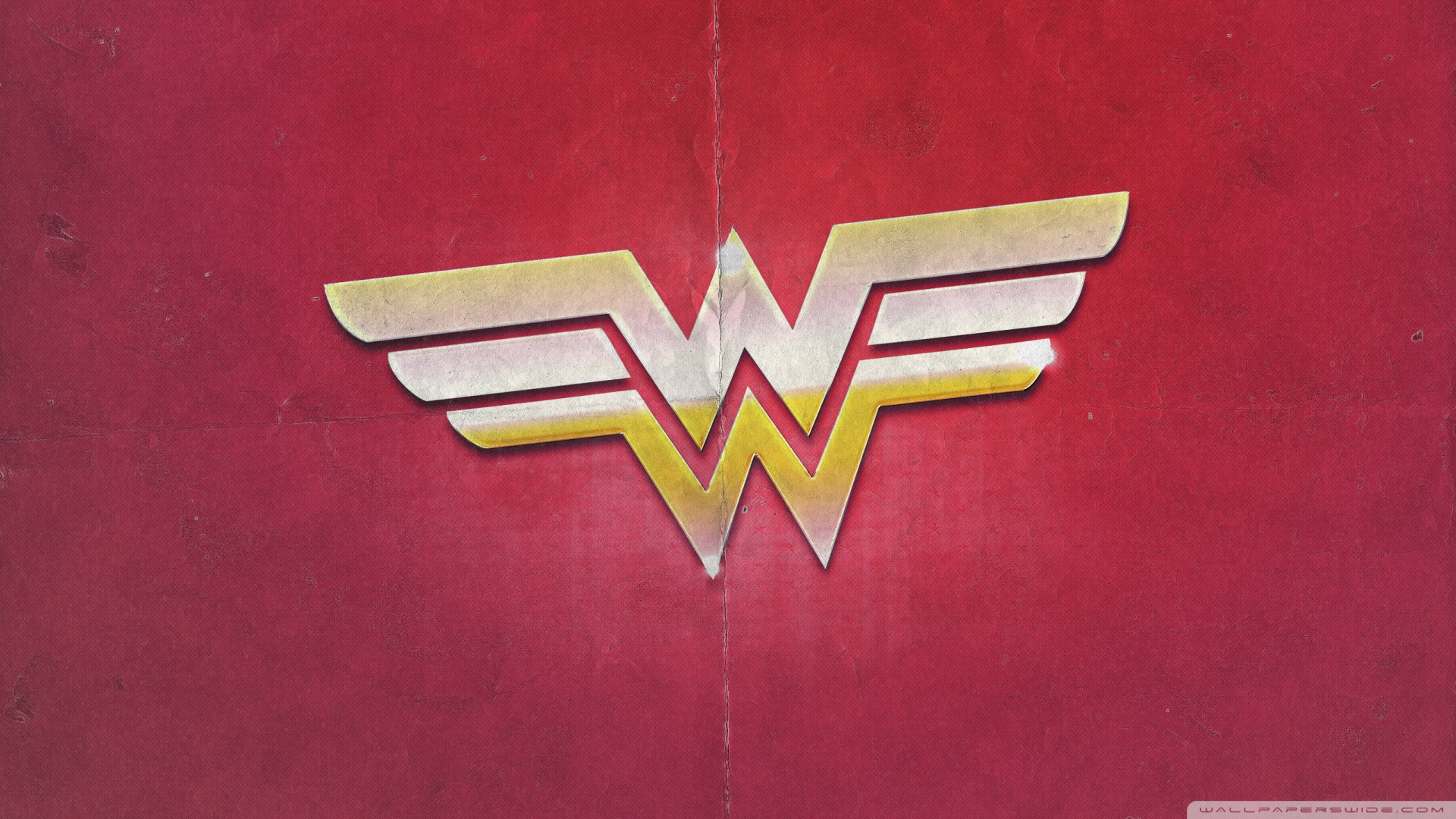 Description: A red wall with a gold wonder logo on it and a white wing on the bottom of the wall.