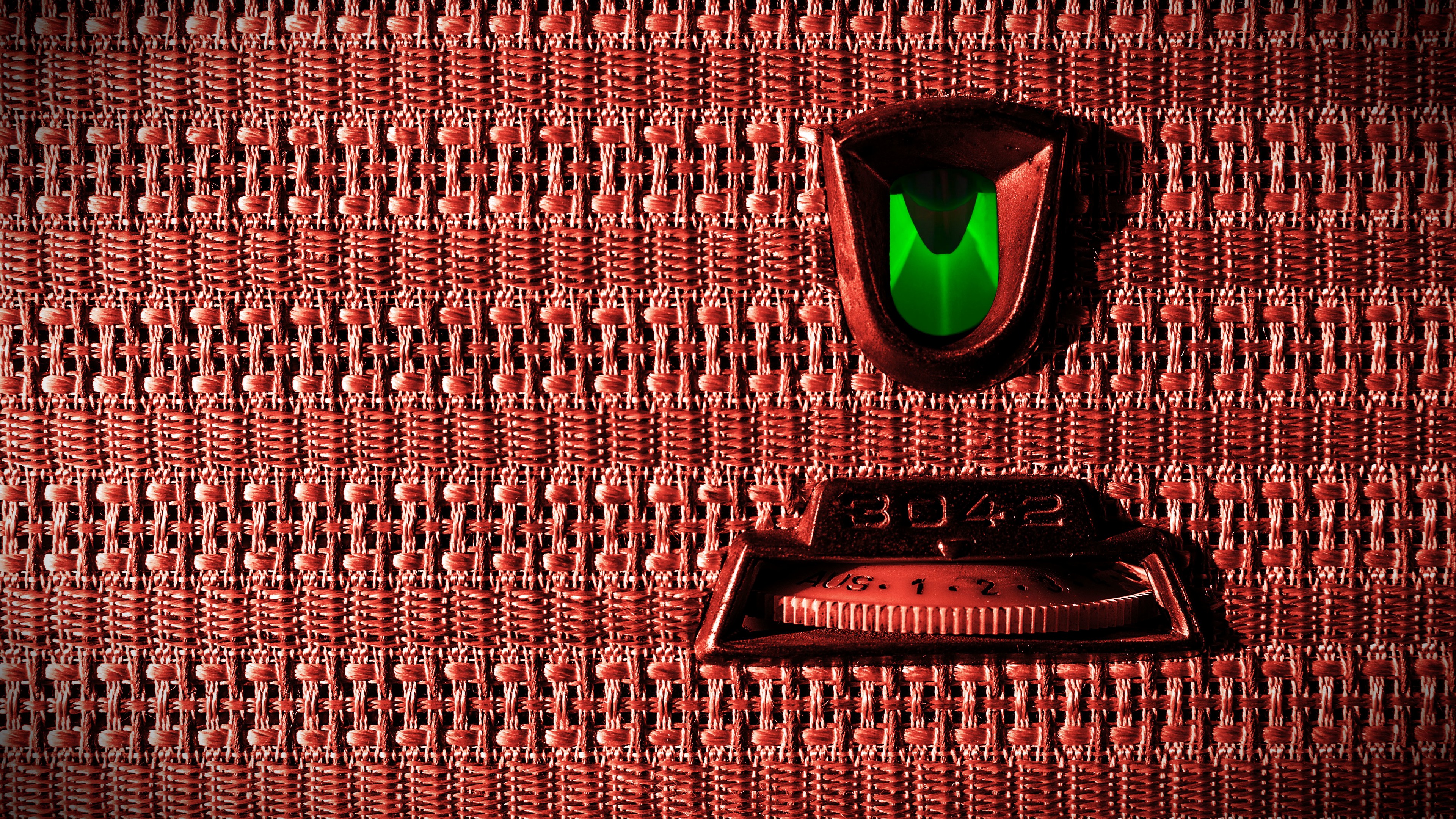 Description: A red wall with a green light on it and a black object on the wall behind it that says supe.