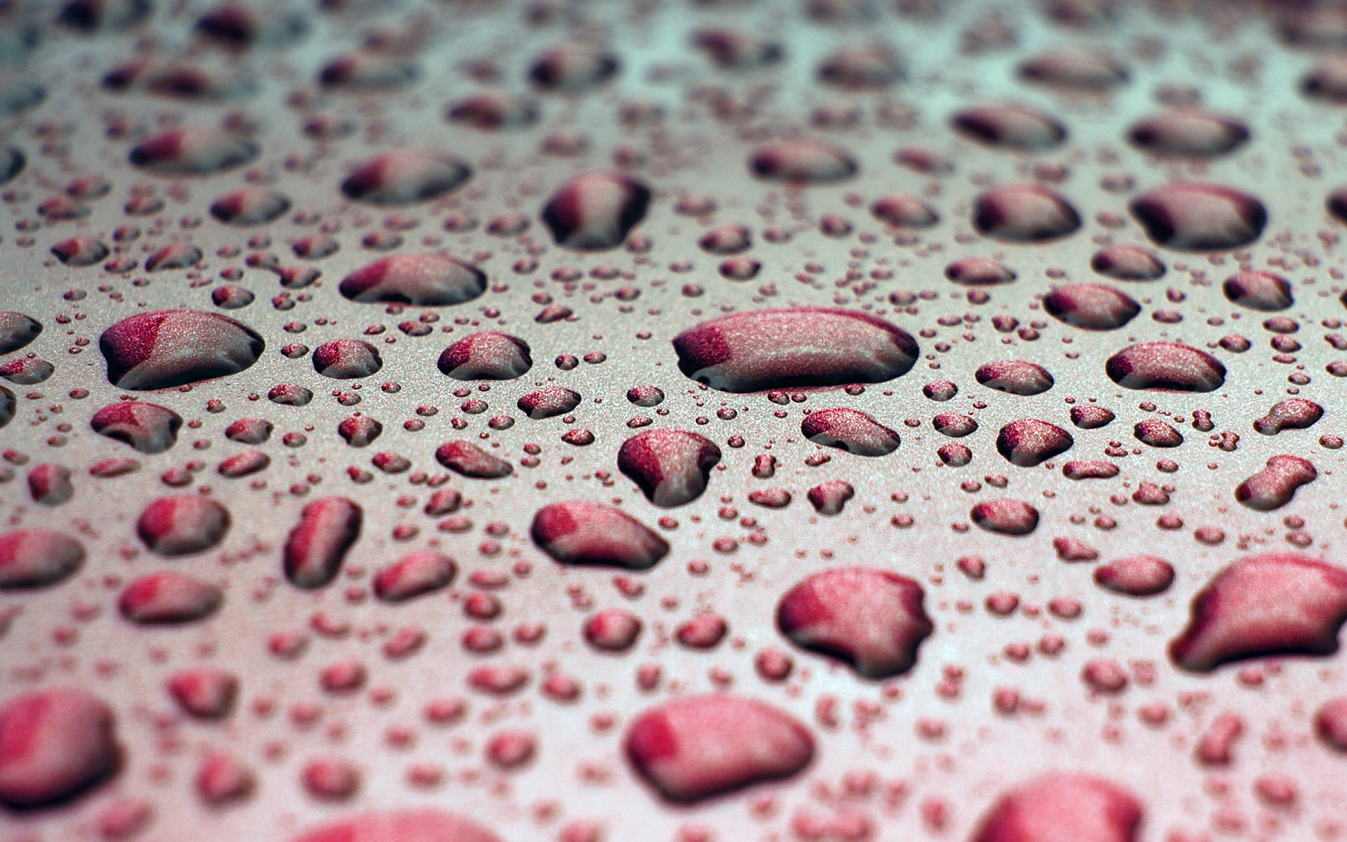 Description: A close up of a red surface with drops of water on it and a black background with a white border.