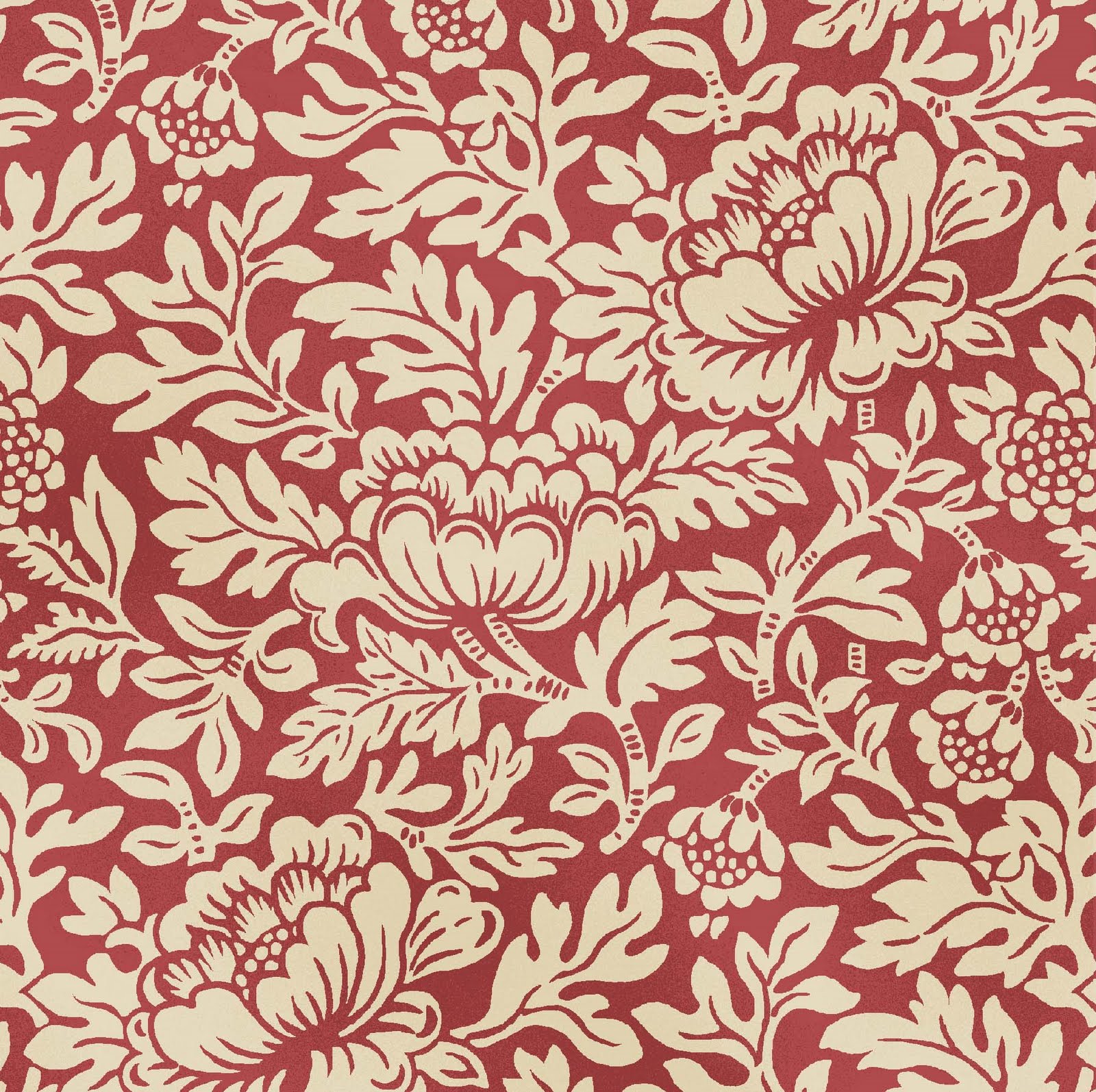 Description: A red and white floral pattern on a red background with white flowers and leaves on a red ground with a white border.