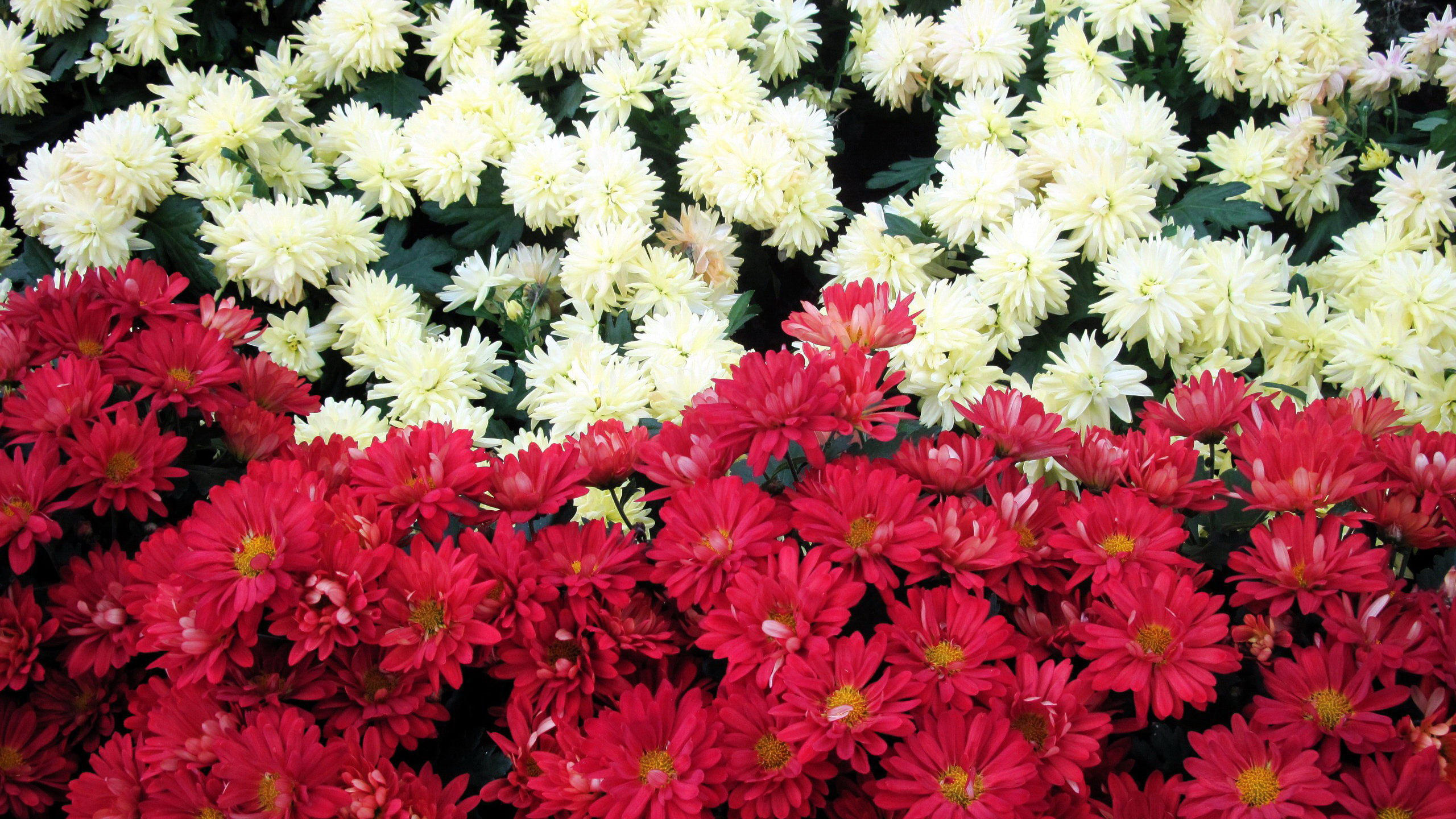 Description: A bunch of red and white flowers in a garden area with green leaves and a yellow center in the center.