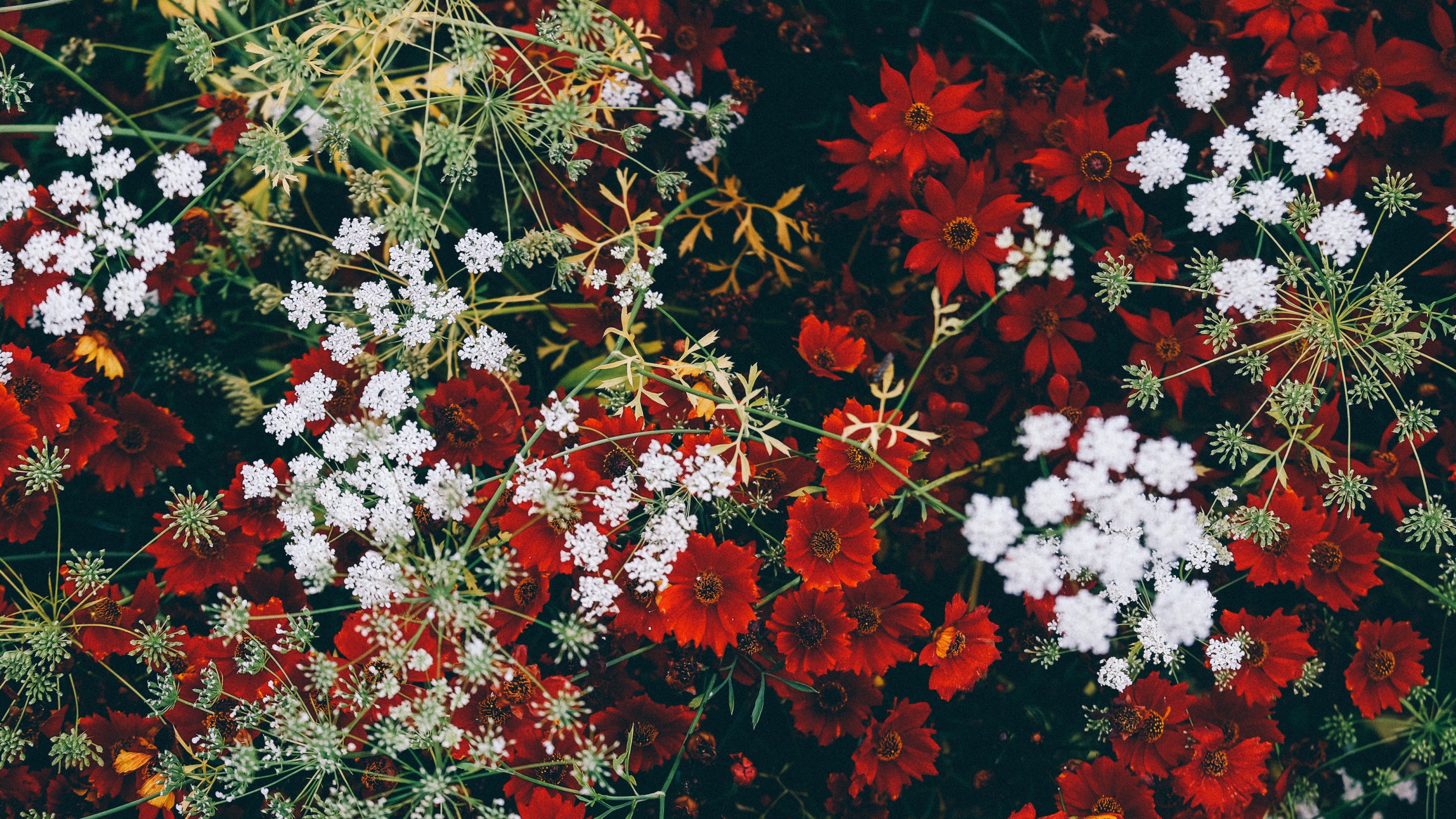 Description: A bunch of red and white flowers in a field of grass and flowers in the background.