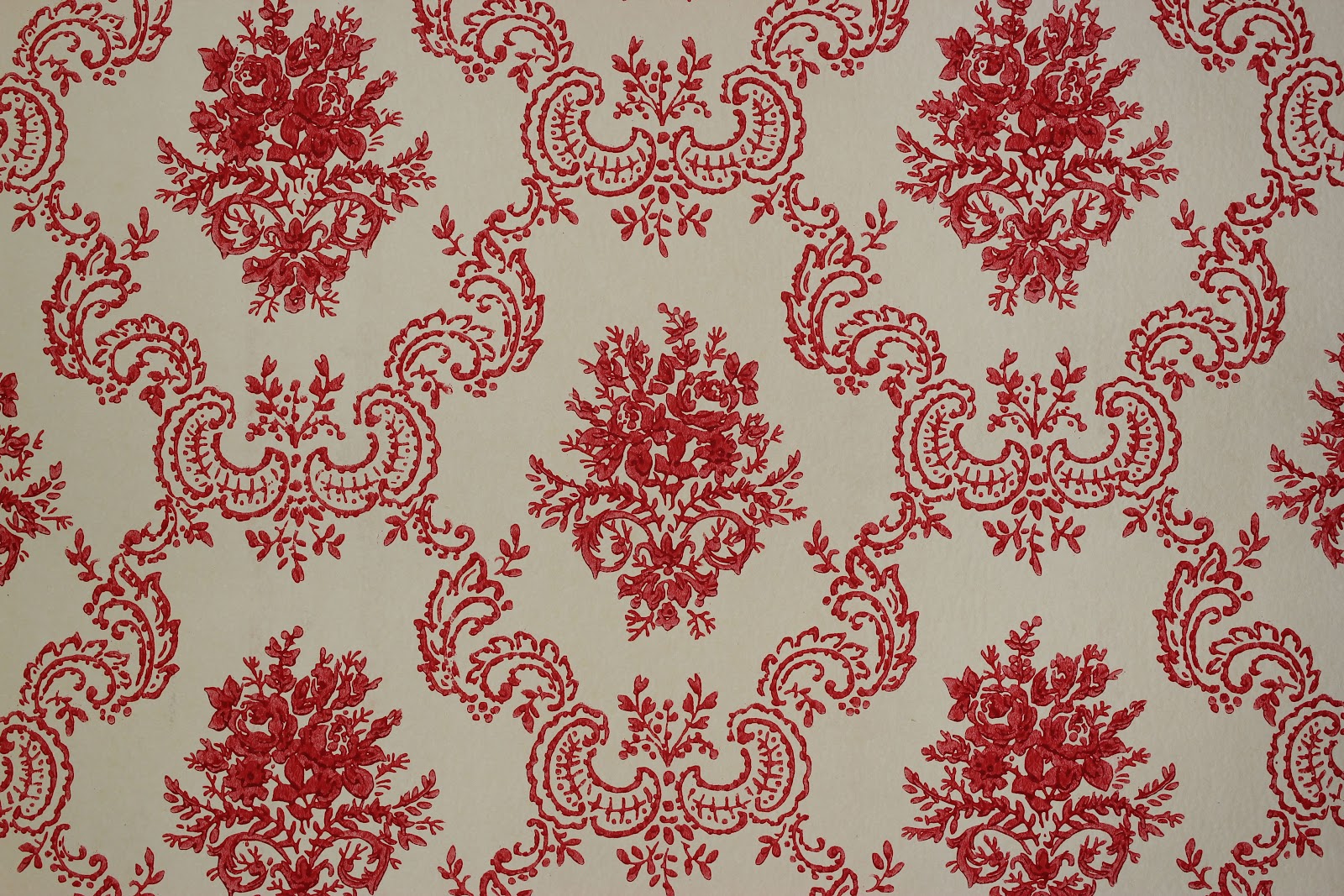 Description: A red and white wallpaper with a pattern of flowers and leaves on it's surface.