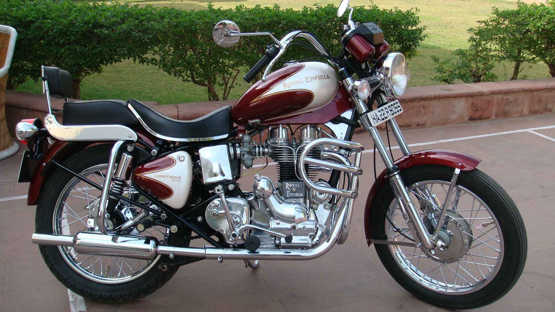 Description: A red and white motorcycle parked in a parking lot next to a bush and a sidewalk with a sidewalk divider.