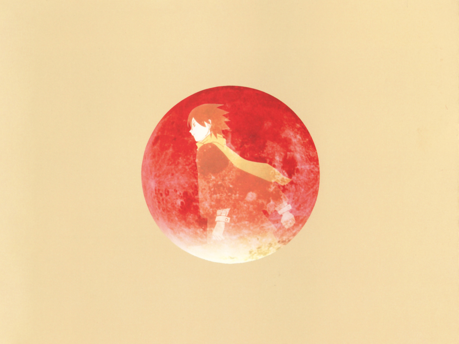 Description: A red and white picture of a person with a red ball in the background and a yellow sky in the background.