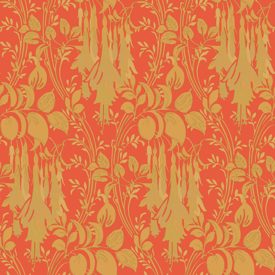 Description: A red and yellow wallpaper with a pattern of flowers and leaves on it.