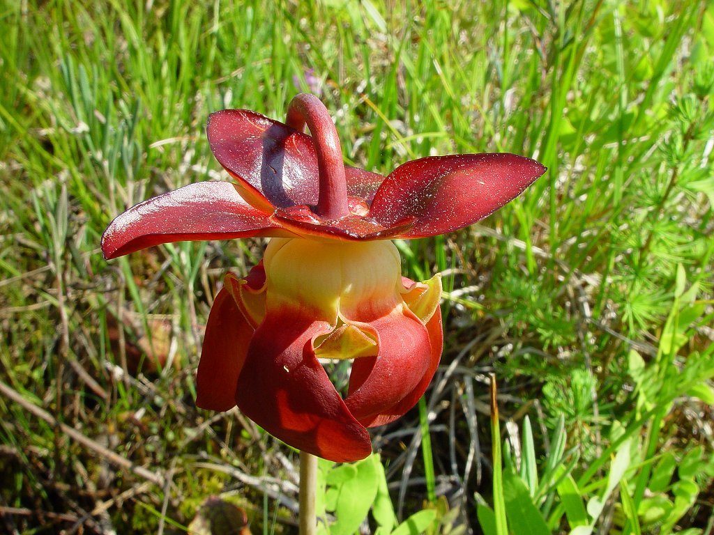 Description: A red and yellow flower in a field of grass and weeds with a bug on it's flower.