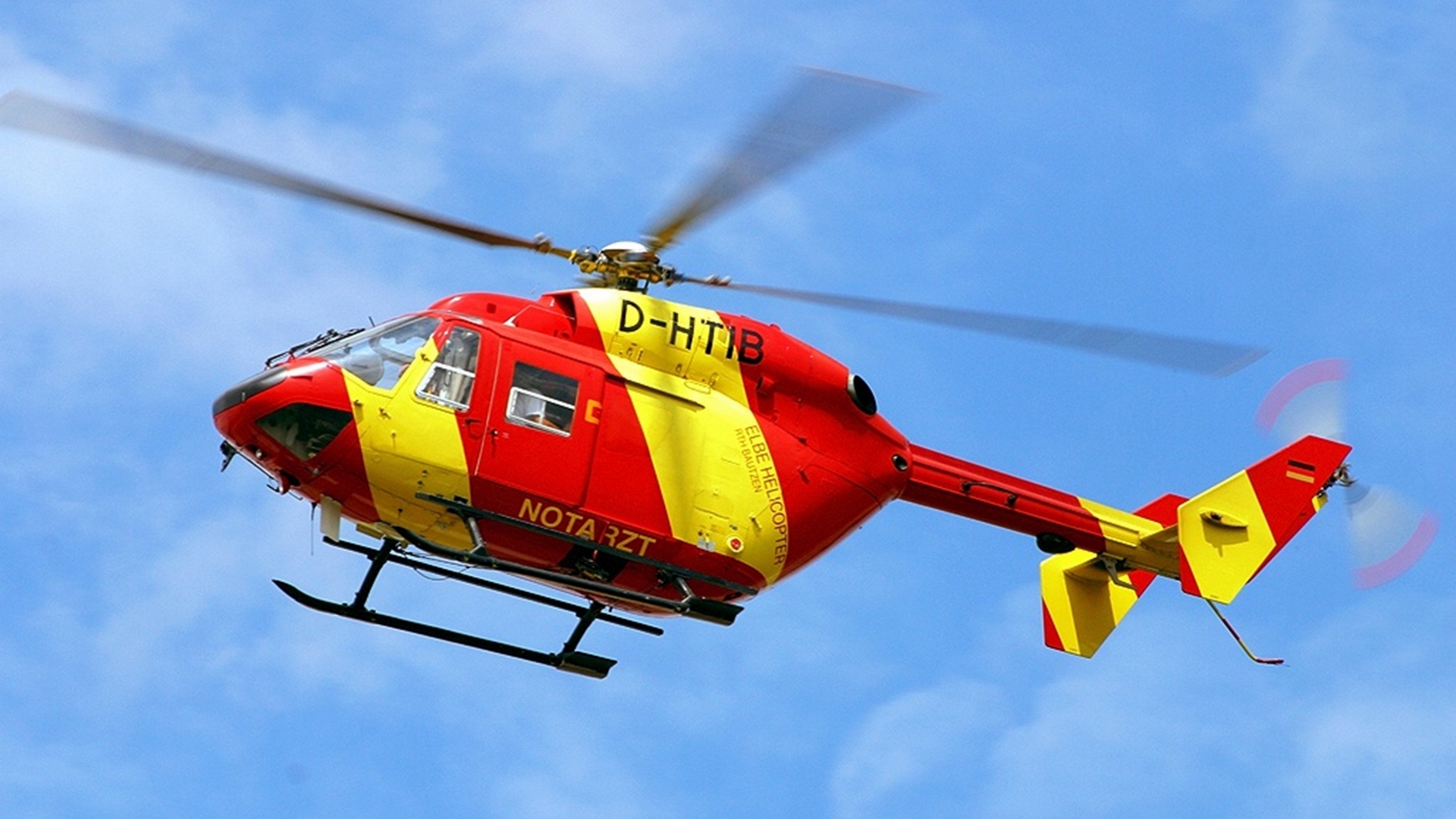 Description: A red and yellow helicopter flying through a blue sky with clouds in the background and a person standing on the deck.